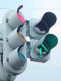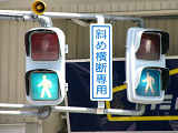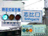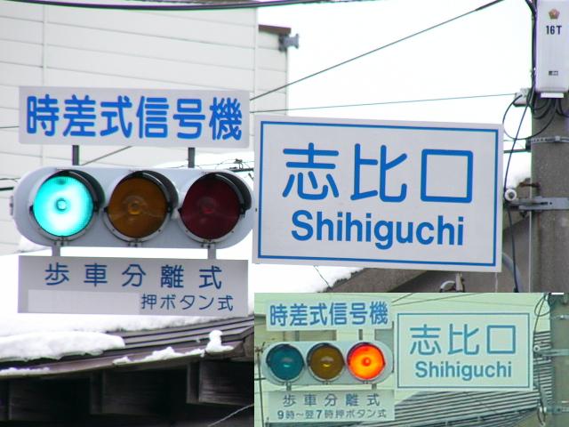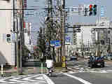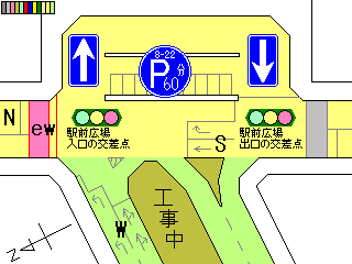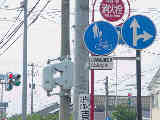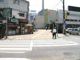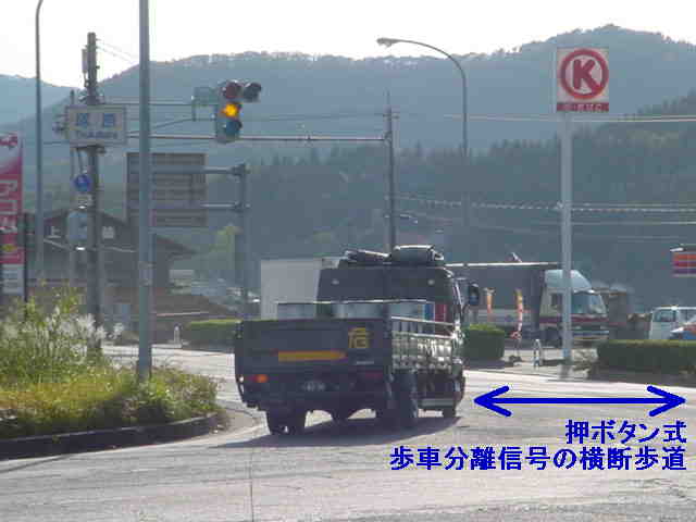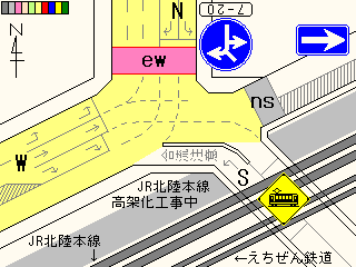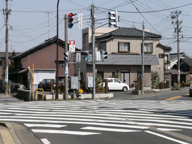 この交差点、かなり複雑な形状で、さらにすぐそばには踏切まであります。そのためかSの車両に対する信号はありません(常時左折のみ可)。Sの左折車とNの右折車が交差点内で合流する不思議な交差点です。というか、この交差点、車灯が2基しかありません。また、横断歩道も2ヶ所しか無く、これでは不十分だと思います。実際、私は(横断歩道の無い)Sの前方を横断しましたが危険を感じました。 なおこの内容は2002年7月に調査したものであり、現在の状況とは異なります。