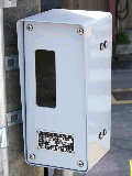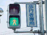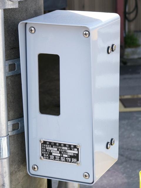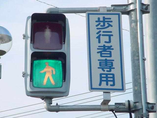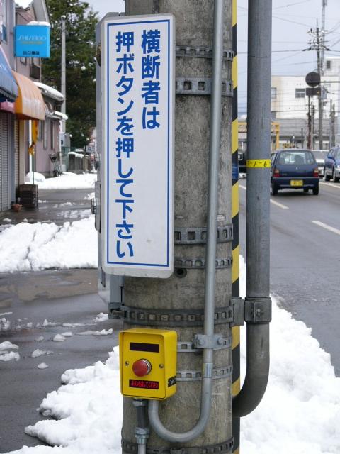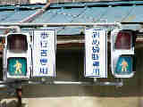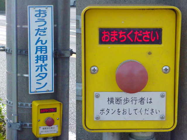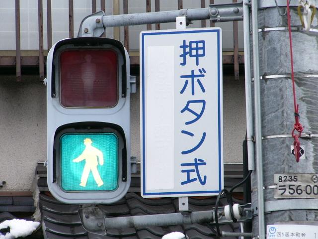 現在は時刻に関係なく「押ボタン式」になっています。標示板は当初のものを流用しているので、シールを貼って修正してあります。 |