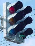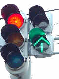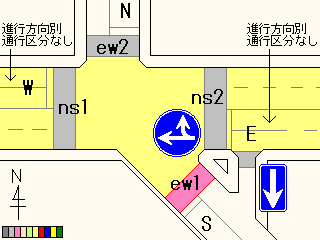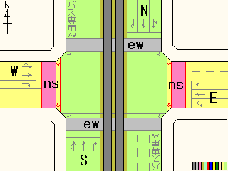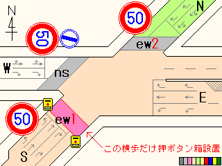 ew1は押ボタンを押した時に歩車分離になりますが、押さない時も歩行者用信号が青になり、歩行者は横断することができます。ただしその時、歩行者用信号が青になる前からEは左折しているため、歩行者は左折車が途切れる瞬間を見計らって横断しなければなりません。 押ボタン箱はew1の横断歩道だけにありますが、押ボタンを押した時はew2の横断歩道も歩車分離になります。歩車分離信号になっている時はew1、ew2の横断とともに、Eの直進のみ可能です。Wは第1車線に直進車と左折車が混在するため直進できず、赤信号のままです。歩行者用信号が青点滅になるのと同時にEとWは青信号になります。普段ここをよく通るEの左折車ドライバーは(通常は)青信号の前に左折矢印信号がでると分かっているため、歩車分離信号作動時でも左折車が停止線を越えて少しずつ進んできます。 押ボタンを押してから歩車分離信号が作動するまでのサイクルについて・・・ 下のサイクル表の見方・・・