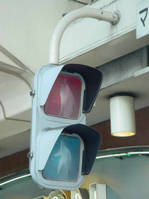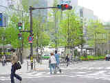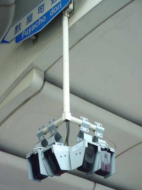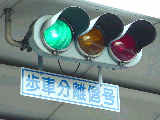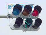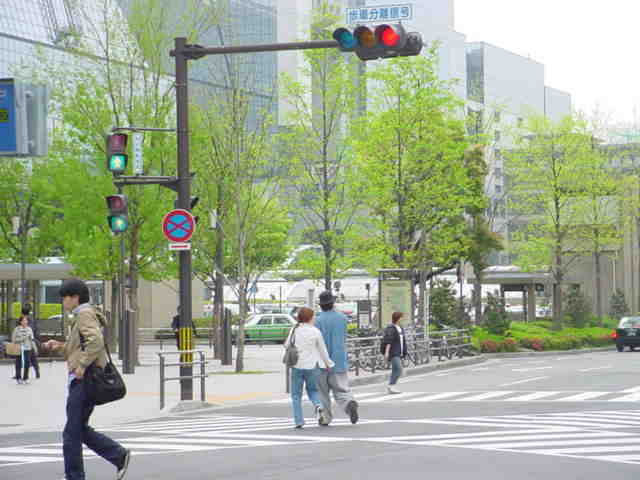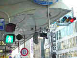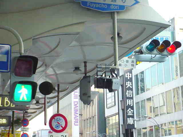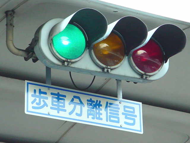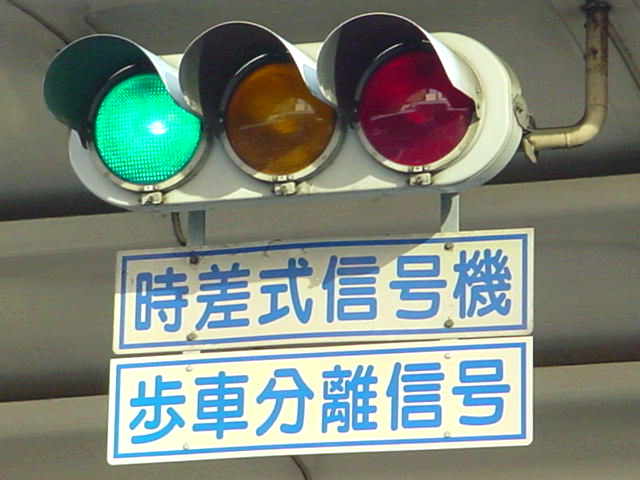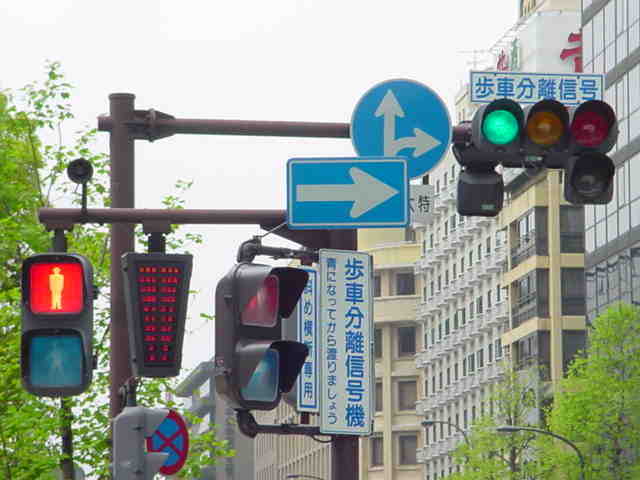 この交差点には視覚障害者用の音響信号が流れます。東西への横断では「カッコー」、南北への横断では「ピヨピヨ」が流れますが、歩車分離の時は「ピヨピヨ」のみが流れます。両方の音を流すと混乱してしまうからでしょう。しかしこれでは東西へ横断する視覚障害者は歩車分離でない状態で横断することになってしまいます。