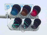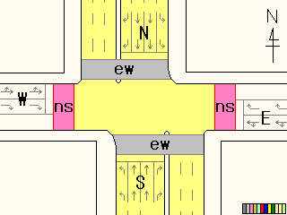 東西から横断する横断歩道(南北の横断歩道)については「歩車分離信号」にはなっていません。東西の道路に直進専用車線を設けられないためでしょう。 「歩車分離信号」となっている側のみ車灯と歩灯に標示板が併設されています。