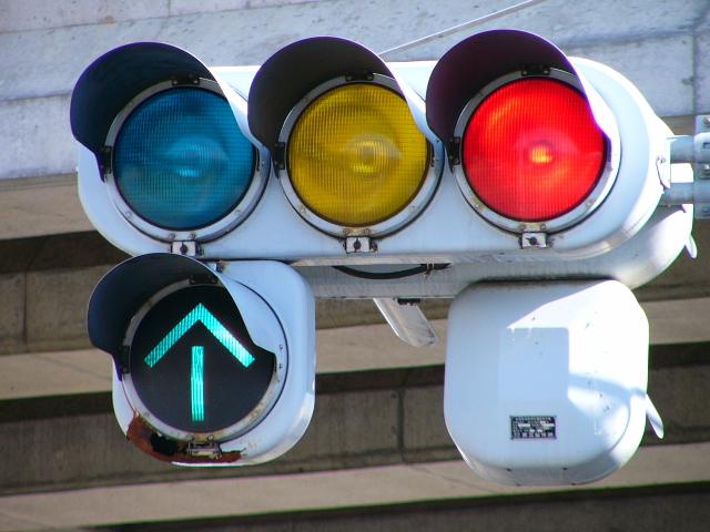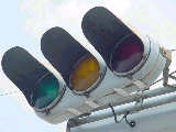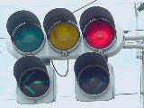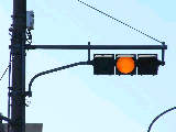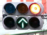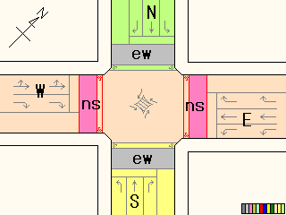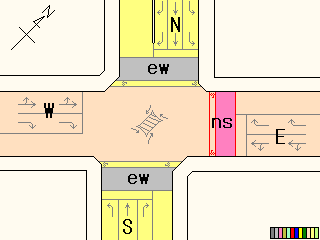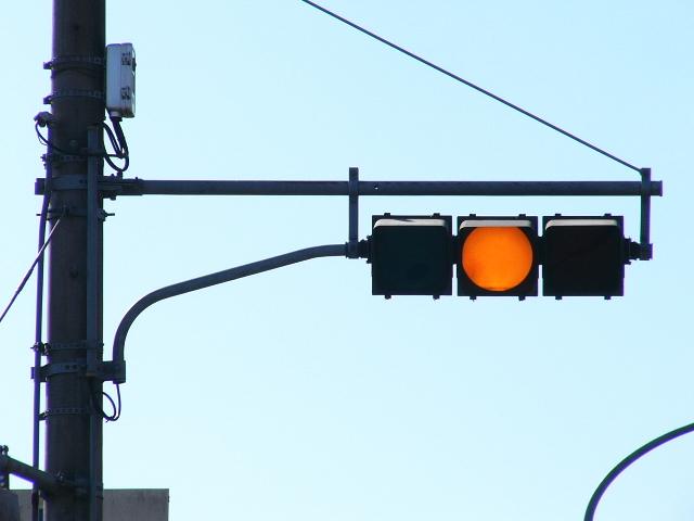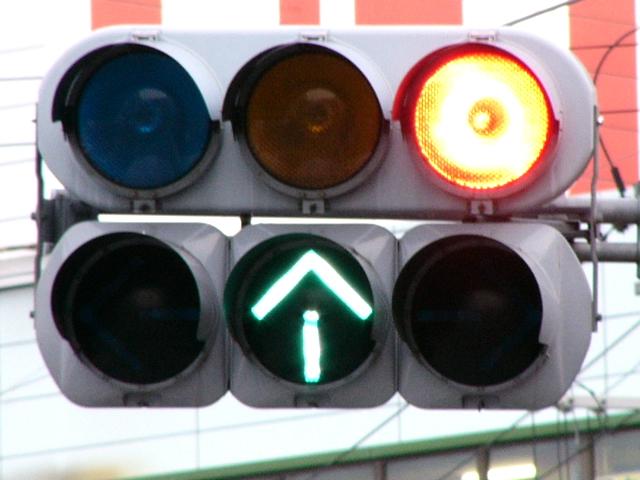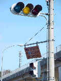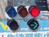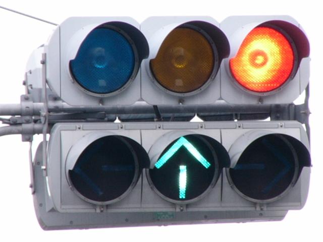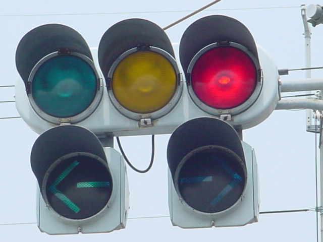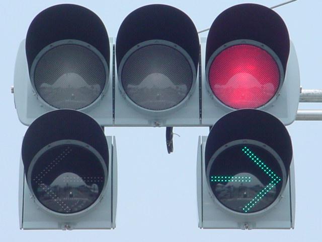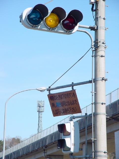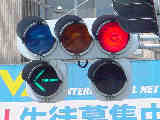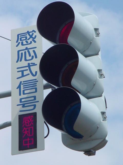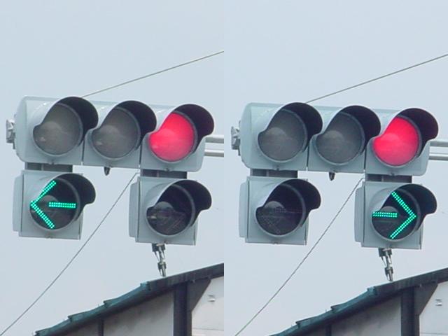 以前は通常の(矢印信号「↑→」による)時差式信号でした。Wの車灯にはその名残で、矢印灯器が外された跡があり、そこにテープが貼ってあります。信号サイクル変更の時に1基のみLED式車灯に交換されましたが、その灯器は赤しか点灯しないため勿体無く思います。