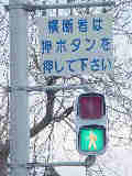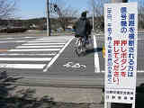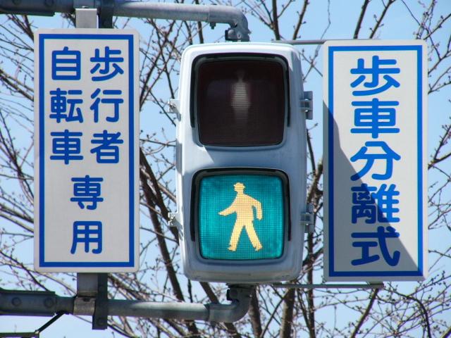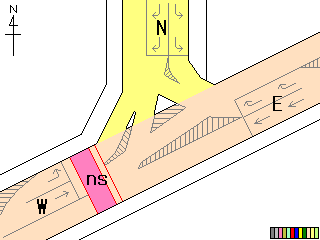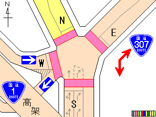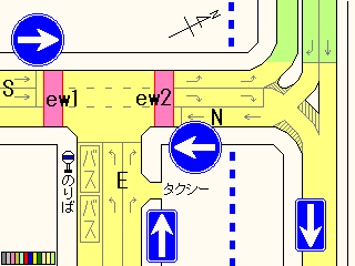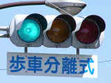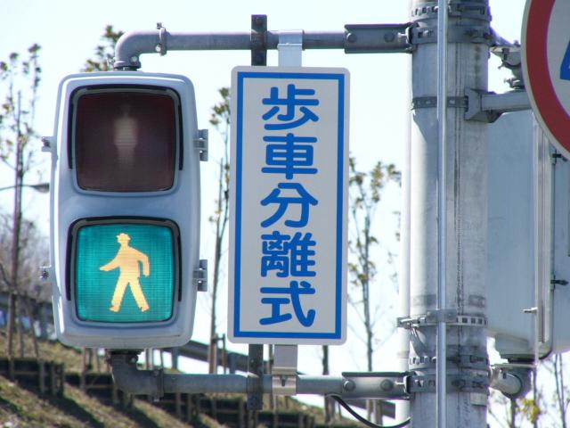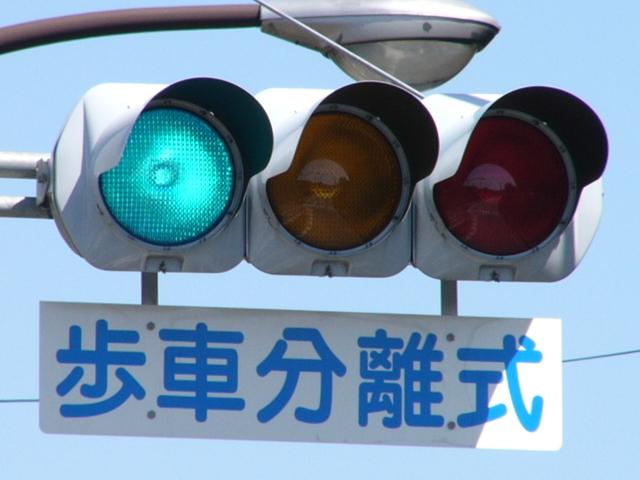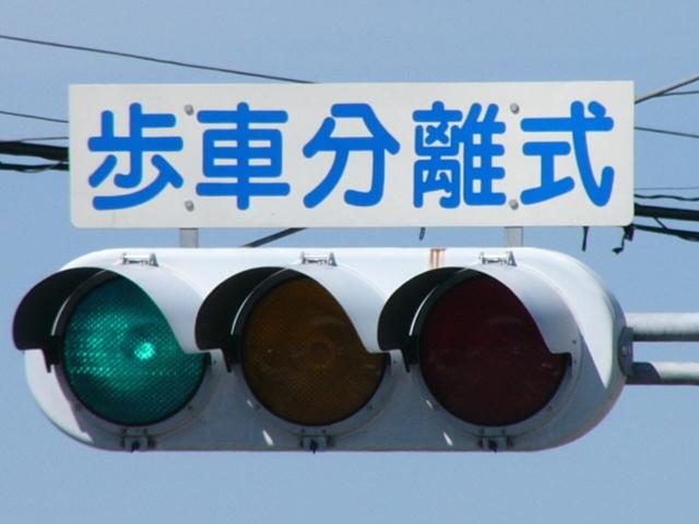 従道路と並行する横断歩道が歩車分離になっています。従道路の右左折車は交互に右左折するため、その時、交錯しない横断歩道は横断できます。左右の横断歩道が別々に青信号になるにもかかわらず、いずれも「カッコー」が鳴るので混乱しそうです。右左折それぞれの矢印信号が出た後は黄を挟まずに赤になります。また、従道路車両が右折できる時は、一番左の車線の路線バスも同時に右折します。