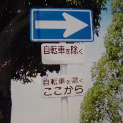 一方通行(自転車を除く・始まり)(自転車を除く ここから)? 余計な標識を設置しています。 どちらの補助標識も同じ意味なので、どちらかが不要です。 現在は修正されています。 撮影 大阪府摂津市 掲載 2002/11/13 |