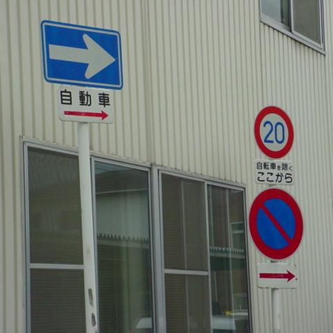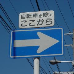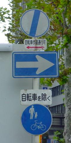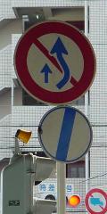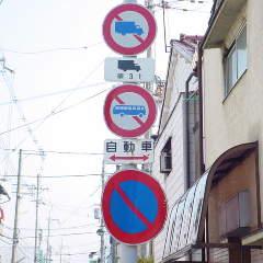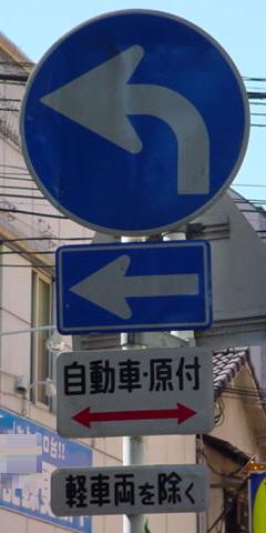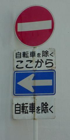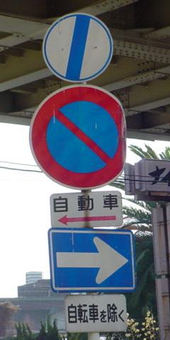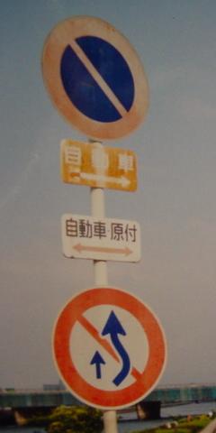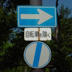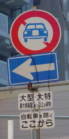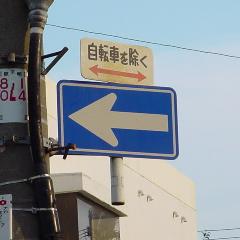 ??? 標識の順番を間違って設置しています。 補助標識「自転車を除く」は「一方通行」標識に設置されるべき補助標識です。なお、工事により「一方通行」規制は解除されています。 撮影 大阪市港区 掲載 2002/11/13 |