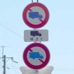 特定の最大積載重量以上の貨物自動車通行止め及び大型貨物自動車等通行止め? 間違った標識を設置しています。 撮影 大阪府門真市 掲載 2002/5/20 |