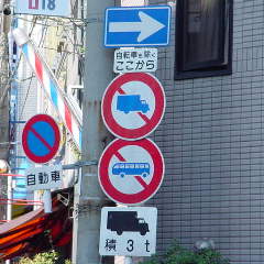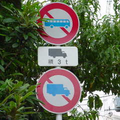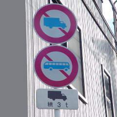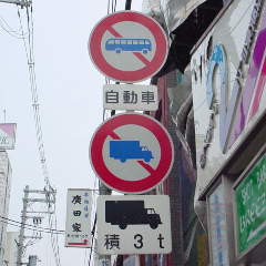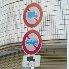 大型乗用自動車等通行止め(最大積載量3トン以上の貨物自動車と大型特殊自動車)? 1と同じですが標識の順番が異なります。 撮影 大阪市浪速区 掲載 2002/5/20 |