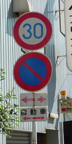 駐車禁止(区間内)(自動車 区間内)? 標識の順番を間違って設置しています。 補助標識「区間内」は「最高速度30」標識に設置されるべき補助標識です。ただし現在、補助標識「区間内」は省略できます。 撮影 大阪市西区 掲載 2002/11/13 |