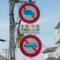 大型乗用自動車等通行止め(最大積載量3トン以上の貨物自動車と大型特殊自動車)? 1と同じ。 撮影 大阪市淀川区 掲載 2002/5/20 |