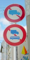 大型乗用自動車等通行止め(最大積載量3トン以上の貨物自動車と大型特殊自動車)? 1と同じですが標識の順番が異なります。 撮影 大阪市天王寺区 掲載 2002/5/20 |