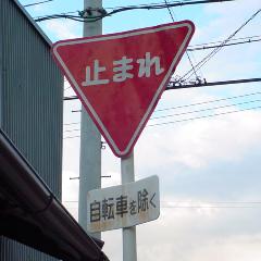 一時停止(自転車を除く) 間違った標識を設置しています。 補助標識「自転車を除く」は不要です。 撮影 大阪市東成区 掲載 2002/11/13 |