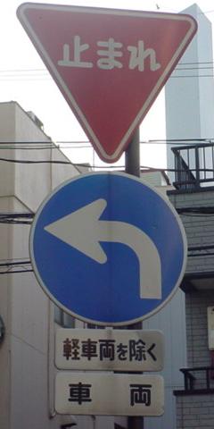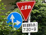 一時停止(車両(軽車両を除く)7:30-9)? 補助標識「車両(軽車両を除く)7:30-9」は「指定方向外進行禁止」標識に設置されるべき補助標識です。 撮影 滋賀県長浜市 掲載 2008/9/6 |