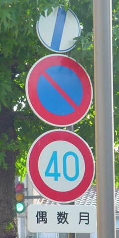 「駐車禁止(終わり)」と「最高速度40(偶数月)(終わり)」? 標識の順番を間違って設置しています。 補助標識「偶数月」は「駐車禁止」標識に設置されるべき補助標識です。ただ、「駐車禁止」標識と「最高速度」標識では、「最高速度」標識の方が重要度が高いので、上から「終わり」「最高速度40」「駐車禁止」「偶数月」の順で設置するのが正解です。 撮影 福井県敦賀市 掲載 2002/11/13 |