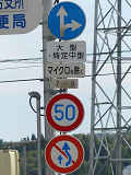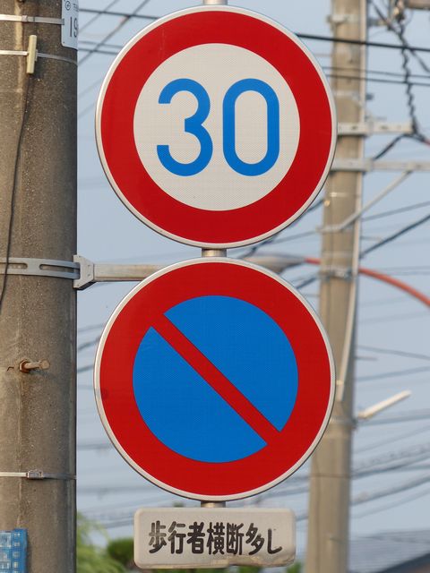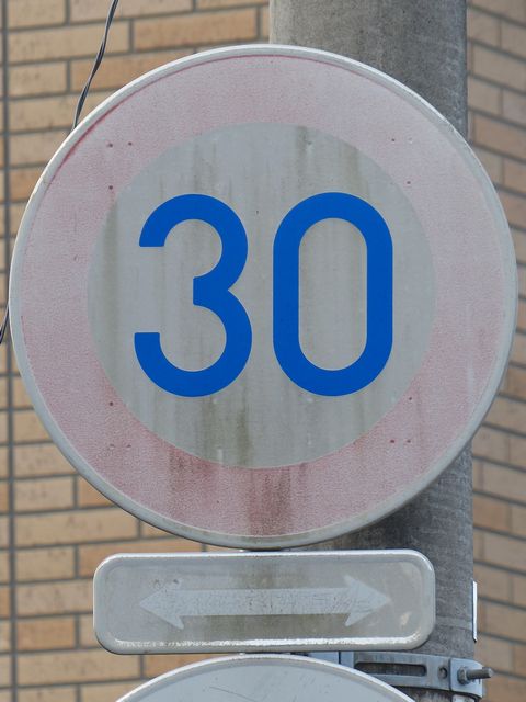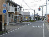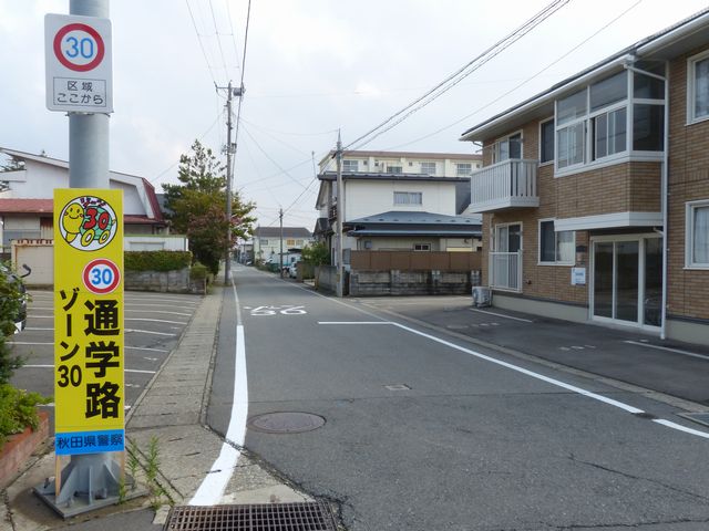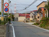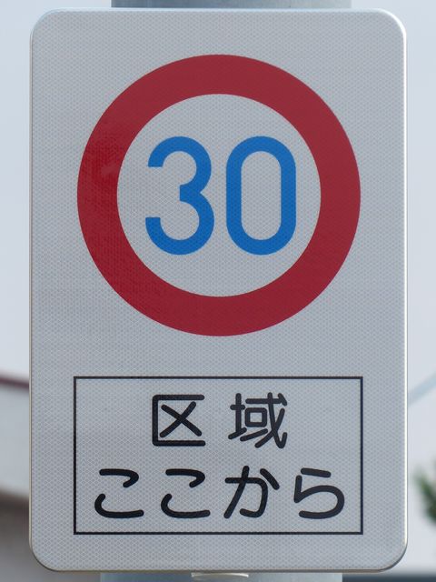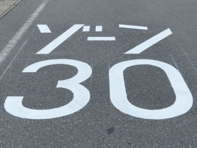区域の入口に背板一体の「最高速度」標識が設置されています。区域の入口の路面には、「ゾーン30」の法定外表示が設置されています。 なぜか区域内の道路に、補助標識「区間内」を附置した「最高速度」標識が設置されています。 |