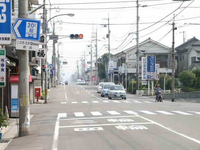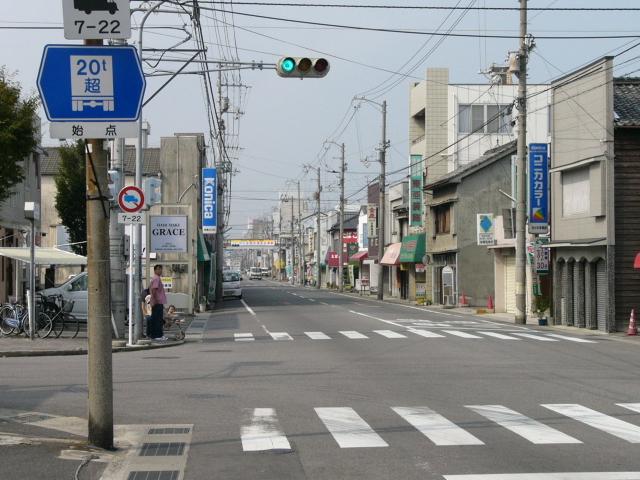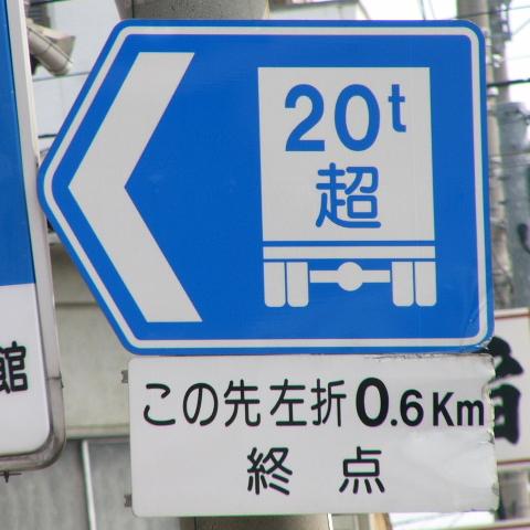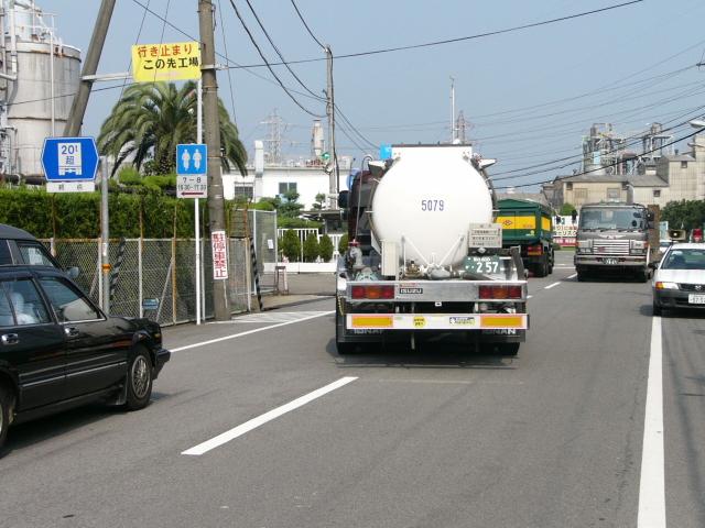 大きな工場に通じる道路で工場の直前で「終点」「始点」となっています。ご覧のように大型自動車が頻繁に通行しますが、時間帯によっては自転車の並進が認められています。