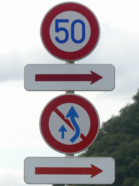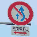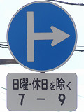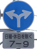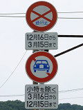 左側画像の上の標識は2枚の補助標識が関連を持っていますが、真ん中画像の補助標識2枚は意味が独立しています。 |