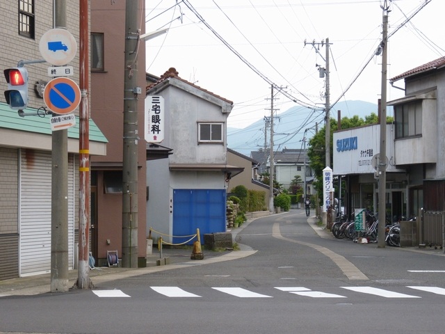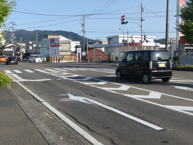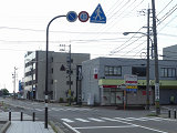 左側のコンビニの駐車場や右側の家電量販店の駐車場から出てきたクルマからは標識が見えません。 |