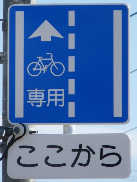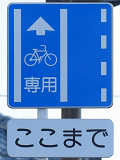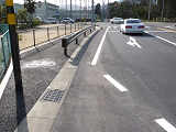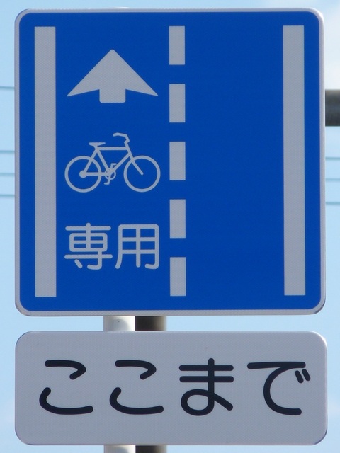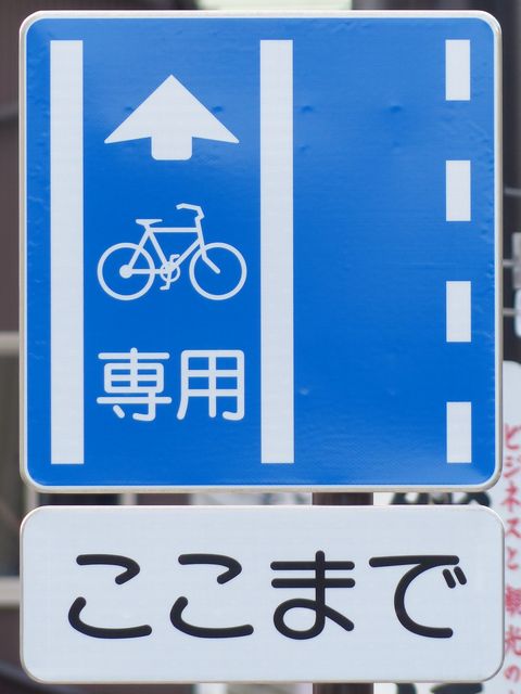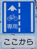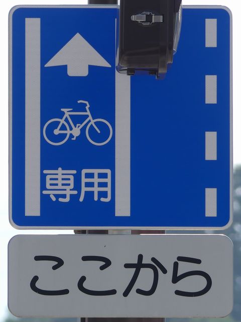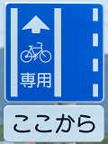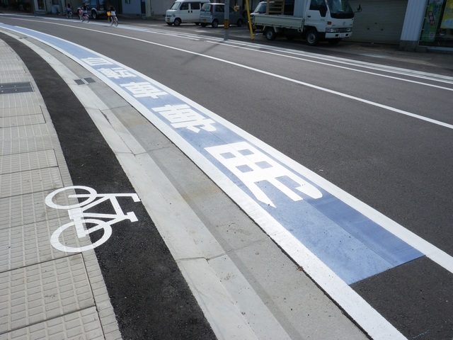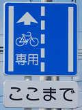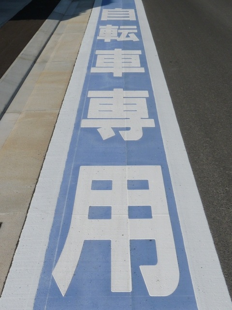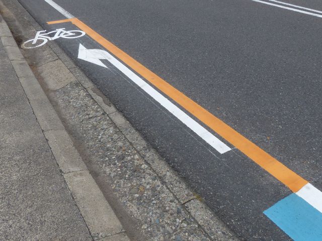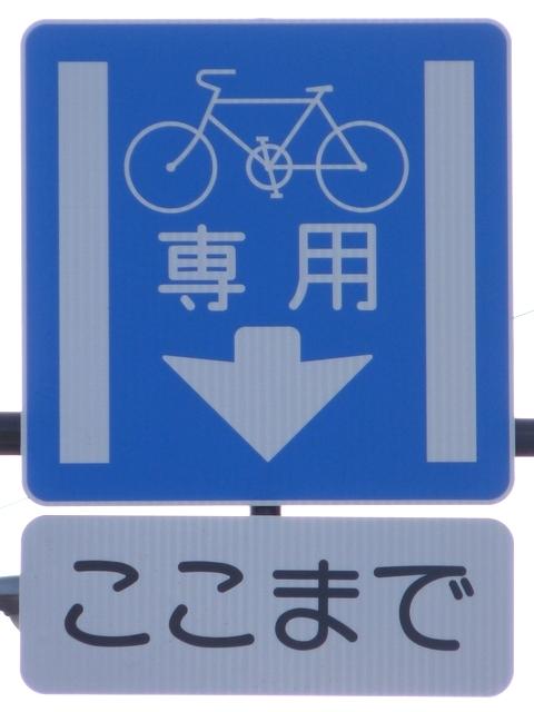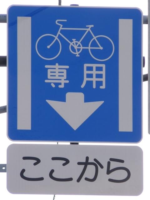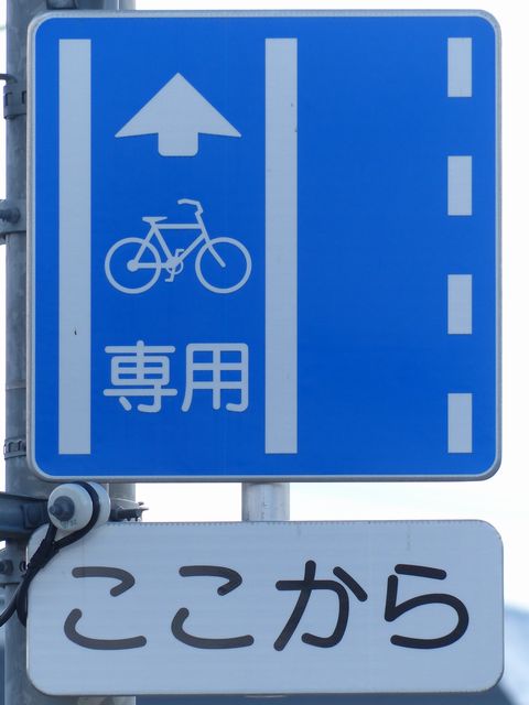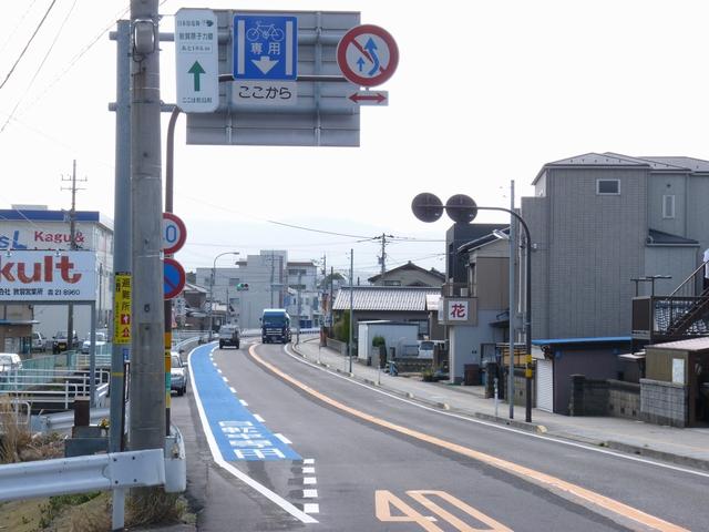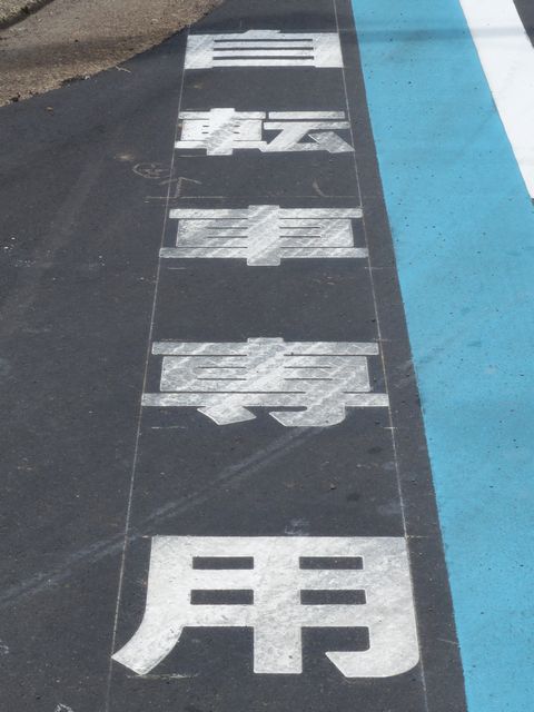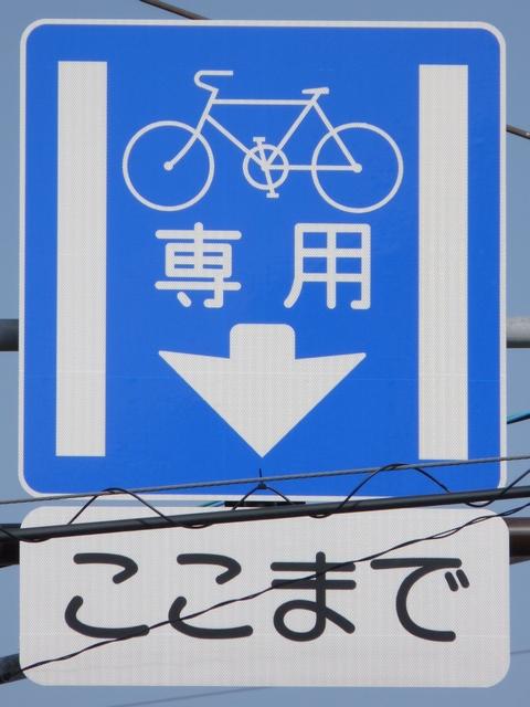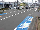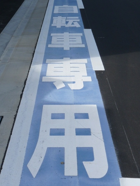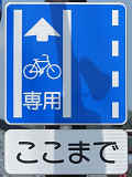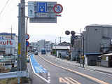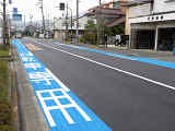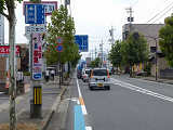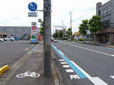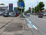 区間の始まりと終わりには、平成22年12月の法令改正で新設された規制標識「普通自転車専用通行帯」が設置されています。区間の始まりと信号交差点の直後には道路標示が設置されています。区間内の路面は、青塗装されていますが、バス停部分は臙脂色塗装となっています。区間内でも信号交差点の前後では、右折待ち車両の左方追抜きのスペースを確保するため、専用通行帯は消滅してしまいますが、歩道に道路標示「普通自転車歩道通行可」を設置し(歩道幅の都合が90°傾けていますが)、自転車が歩道を通行できることを明示していました(もちろん原則は、車道通行です)。自転車専用通行帯の端部においても同様に明示していました。 なお、よく見ると標識の表示が間違っていました。法令の規定では、自転車専用通行帯の両脇を実線、中央線を破線で表示することになっていますが、この標識では専用通行帯の右脇が破線、中央線が実線になってしまっていました。実際の道路標示に合わせたのかもしれませんが、このような変更は、法令や警察庁の通達では認められていません。 その後、正しい表示のものに修正されました。標示板の表面のみ貼り替えたようです。また、歩道の自転車通行可指定が廃止されたようで、道路標示「普通自転車歩道通行可」が撤去されました。この狭い歩道で歩行者と自転車を共存させることには無理があったのでしょう。
