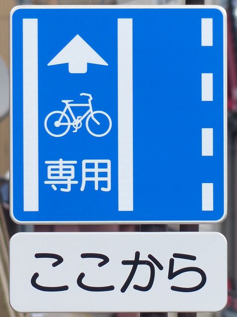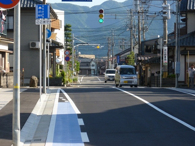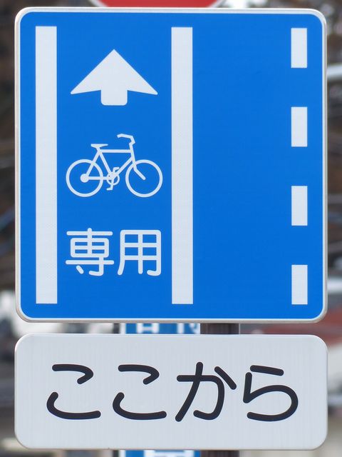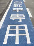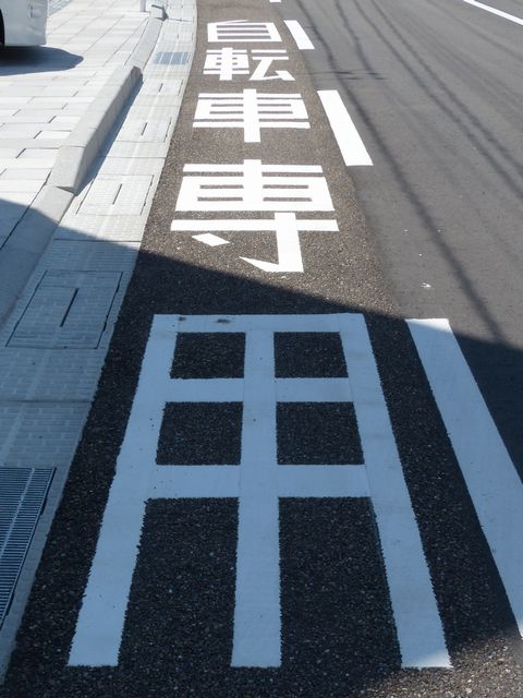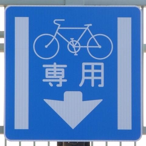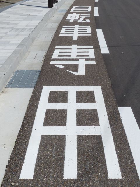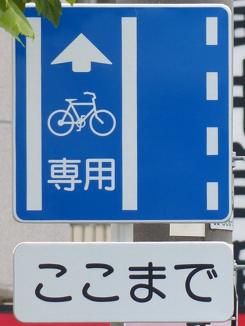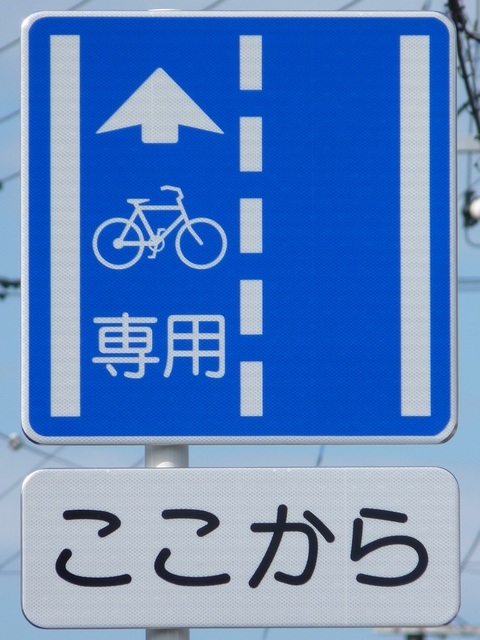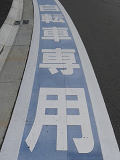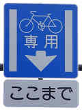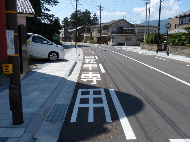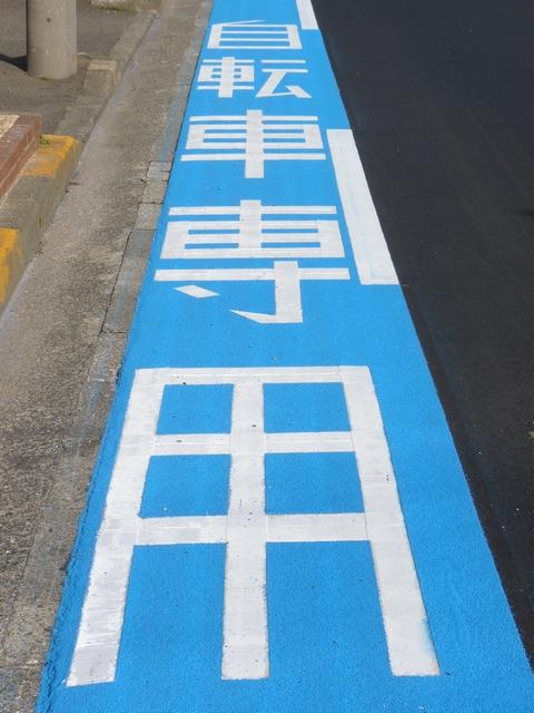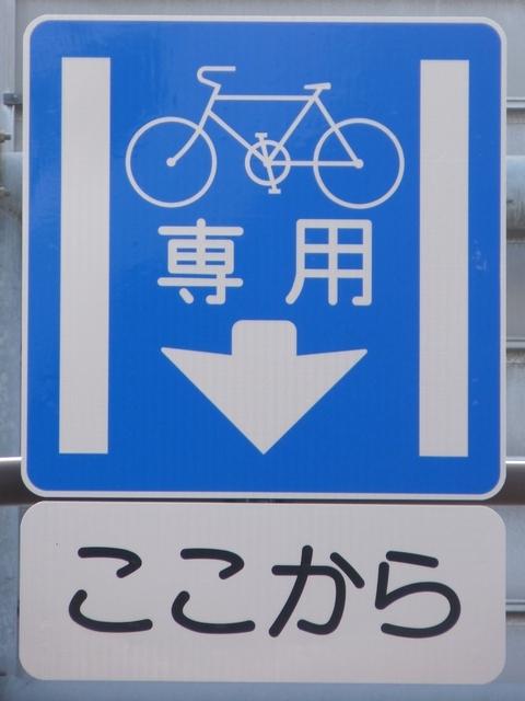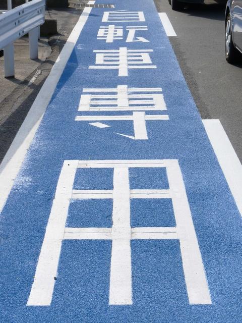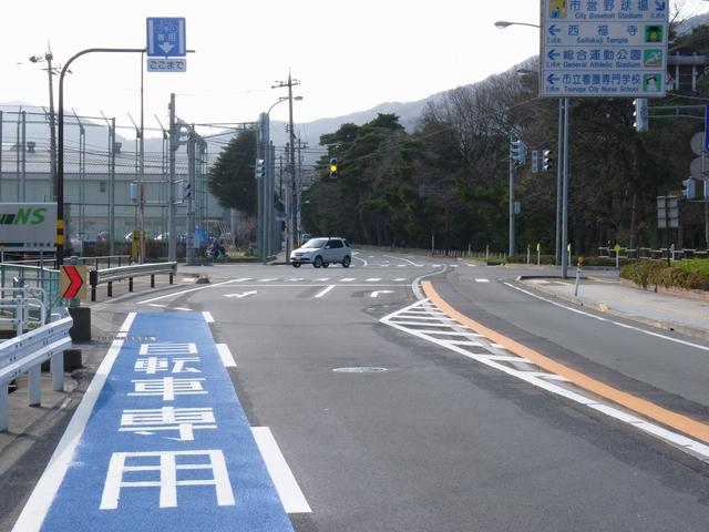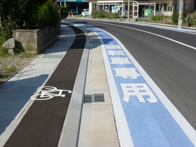 区間の始まりと終わりには、平成22年12月の法令改正で新設された規制標識「普通自転車専用通行帯」が設置されています。区間の始まりと信号交差点の直後には道路標示が設置されています。区間内の路面は、青塗装されていますが、バス停部分は臙脂色塗装となっています。区間内でも信号交差点の前後では、右折待ち車両の左方追抜きのスペースを確保するため、専用通行帯は消滅してしまいますが、歩道に道路標示「普通自転車歩道通行可」を設置し(歩道幅の都合が90°傾けていますが)、自転車が歩道を通行できることを明示していました(もちろん原則は、車道通行です)。自転車専用通行帯の端部においても同様に明示していました。 なお、よく見ると標識の表示が間違っていました。法令の規定では、自転車専用通行帯の両脇を実線、中央線を破線で表示することになっていますが、この標識では専用通行帯の右脇が破線、中央線が実線になってしまっていました。実際の道路標示に合わせたのかもしれませんが、このような変更は、法令や警察庁の通達では認められていません。 その後、正しい表示のものに修正されました。標示板の表面のみ貼り替えたようです。また、歩道の自転車通行可指定が廃止されたようで、道路標示「普通自転車歩道通行可」が撤去されました。この狭い歩道で歩行者と自転車を共存させることには無理があったのでしょう。