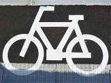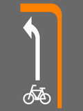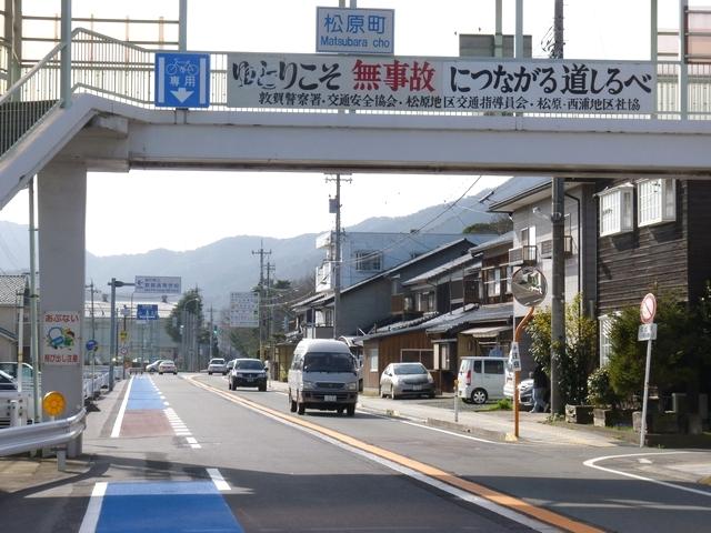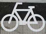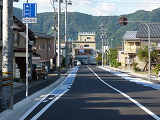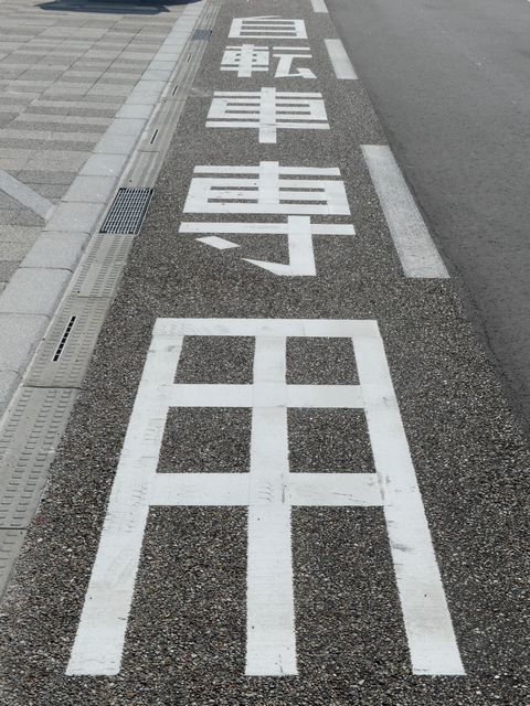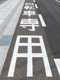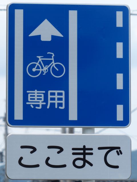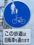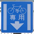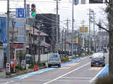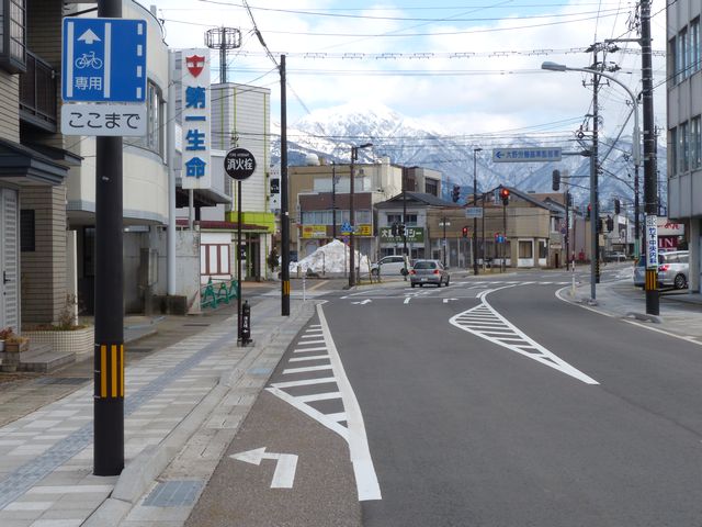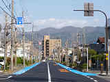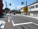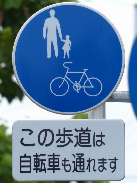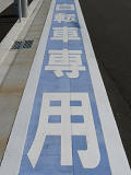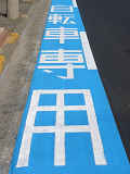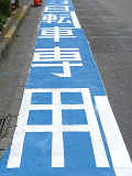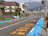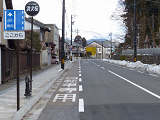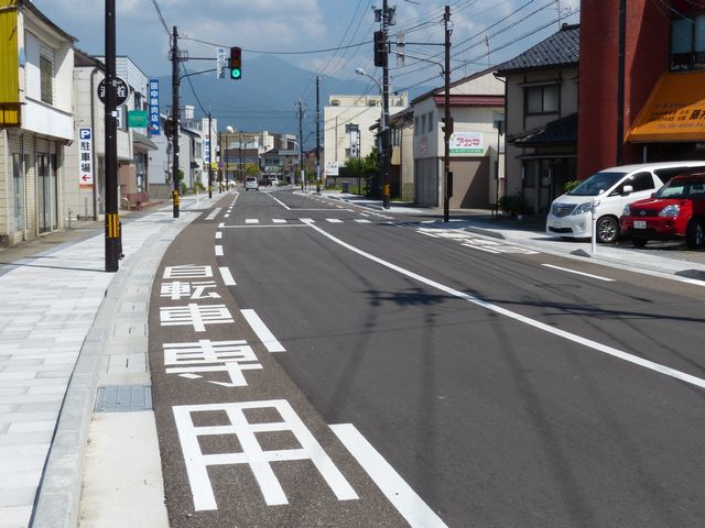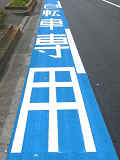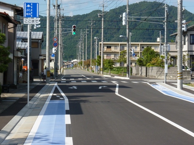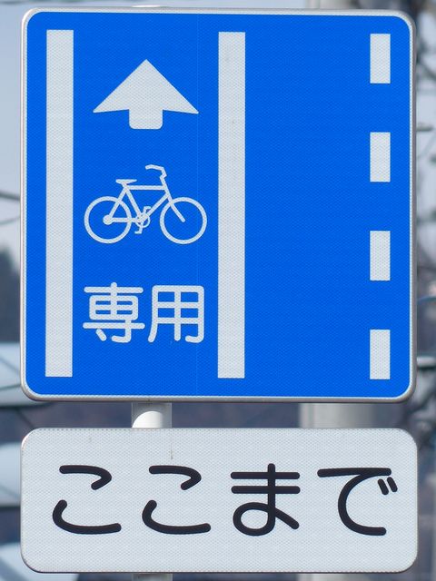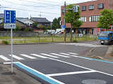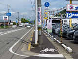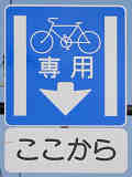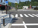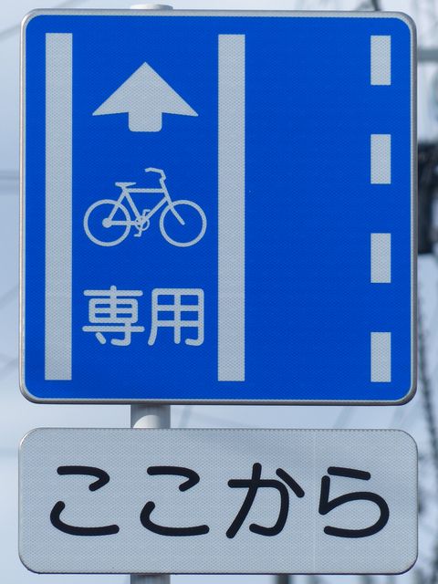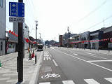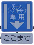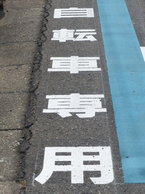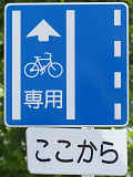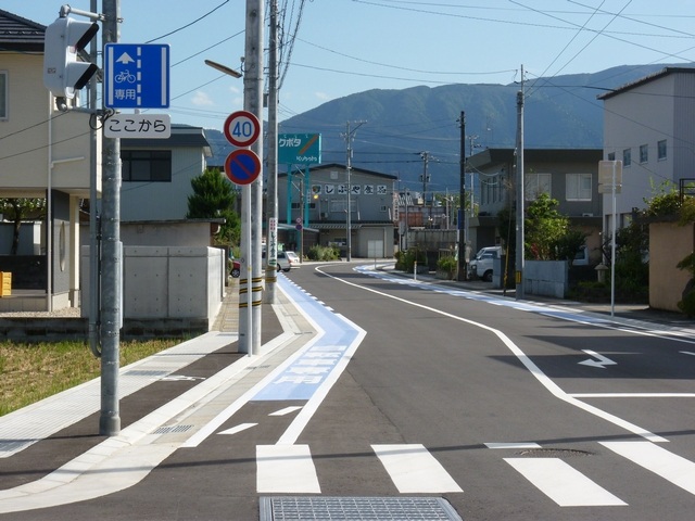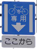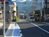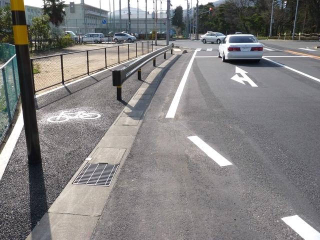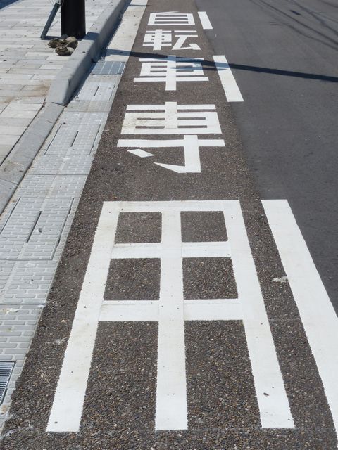 区間の始まりと終わりには、平成22年12月の法令改正で新設された規制標識「普通自転車専用通行帯」が設置されています。区間の始まりと信号交差点の直後には道路標示が設置されています。区間内の路面は、青塗装されていますが、バス停部分は臙脂色塗装となっています。区間内でも信号交差点の前後では、右折待ち車両の左方追抜きのスペースを確保するため、専用通行帯は消滅してしまいますが、歩道に道路標示「普通自転車歩道通行可」を設置し(歩道幅の都合が90°傾けていますが)、自転車が歩道を通行できることを明示していました(もちろん原則は、車道通行です)。自転車専用通行帯の端部においても同様に明示していました。 なお、よく見ると標識の表示が間違っていました。法令の規定では、自転車専用通行帯の両脇を実線、中央線を破線で表示することになっていますが、この標識では専用通行帯の右脇が破線、中央線が実線になってしまっていました。実際の道路標示に合わせたのかもしれませんが、このような変更は、法令や警察庁の通達では認められていません。 その後、正しい表示のものに修正されました。標示板の表面のみ貼り替えたようです。また、歩道の自転車通行可指定が廃止されたようで、道路標示「普通自転車歩道通行可」が撤去されました。この狭い歩道で歩行者と自転車を共存させることには無理があったのでしょう。