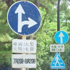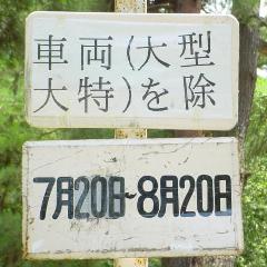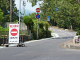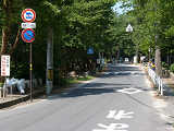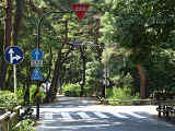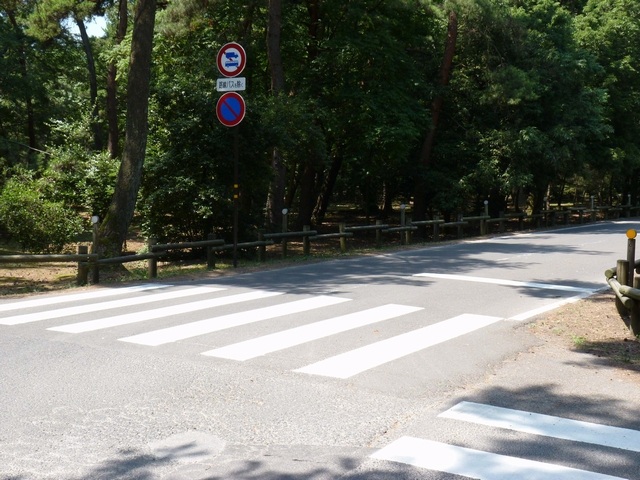 こちらは、松原公園内の道路です。こちらも夏期のみの一方通行規制ですが、一方通行の終点に「車両進入禁止」標識が設置されているだけで、区間内に「一方通行」標識は設置されていません。これでは通行中の車両が一方通行路であることが分からないため、問題があります。(例:区間内で転回してしまう。右折時に右に寄らずに中央に寄ってしまう。等)