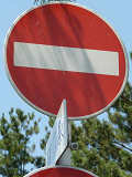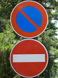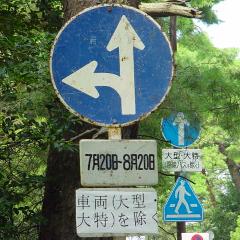 「車両進入禁止」標識の裏面には「敦賀警察署」のラベルが貼られています。 規制区間に交差している道路には「指定方向外進行禁止」標識が設置されています。うち1枚には裏面に公安委員会設置の記載があります。昭和49年7月製の古いものです。 一方通行関連の標識は、規制期間のみ設置されており、それ以外の期間は撤去されています。