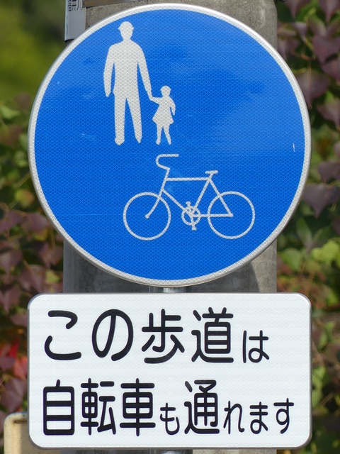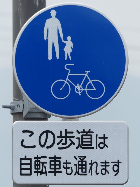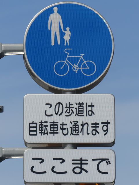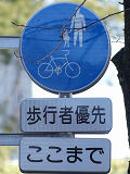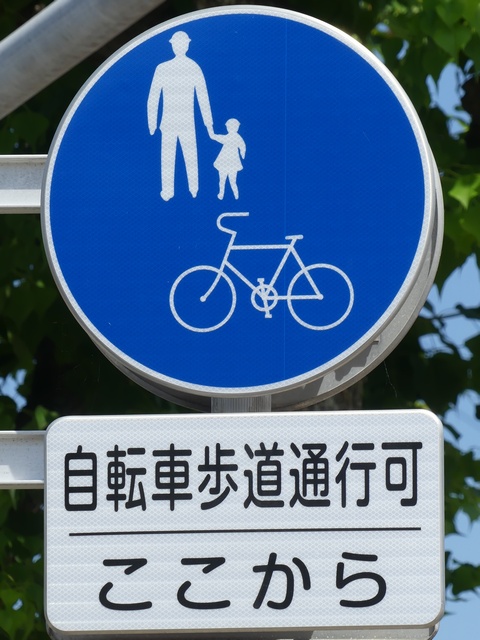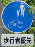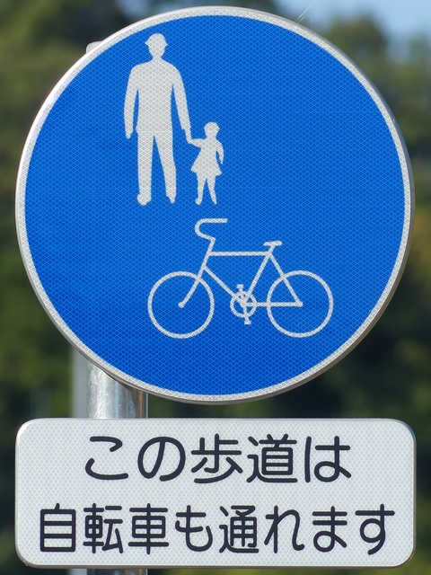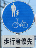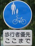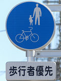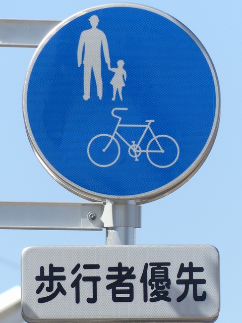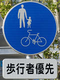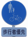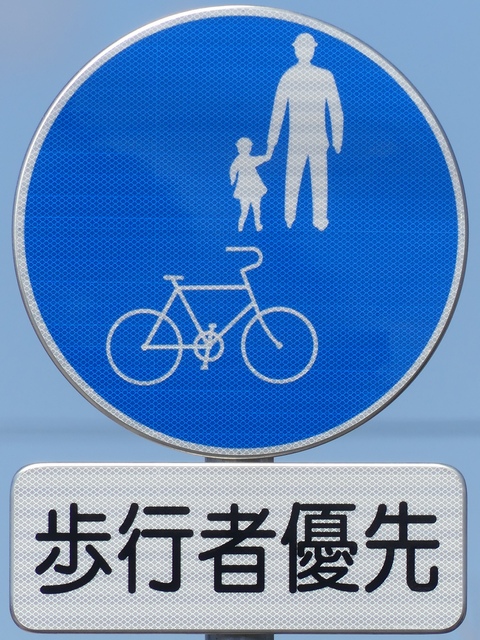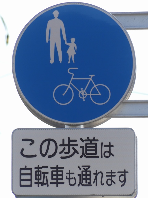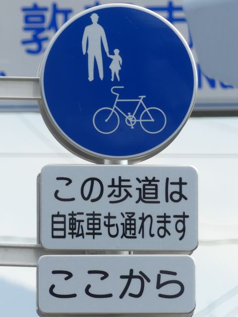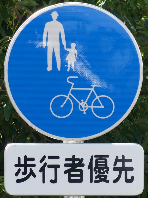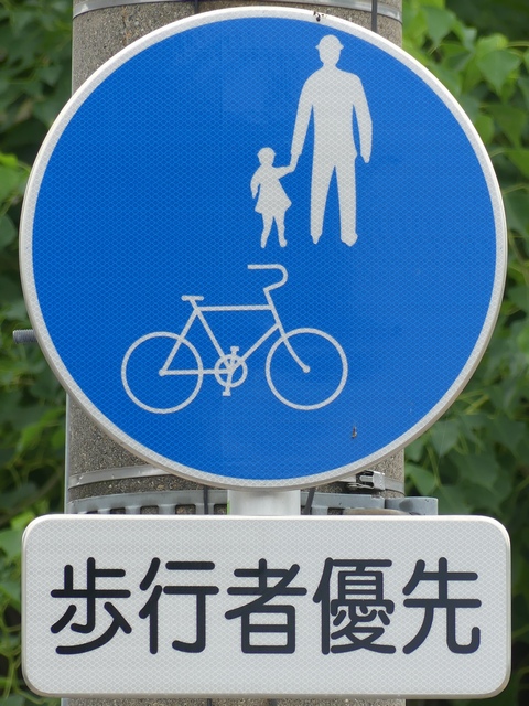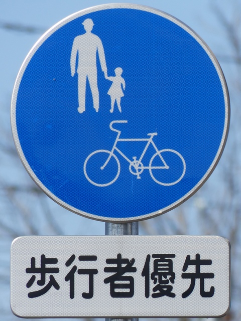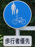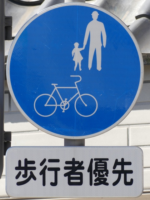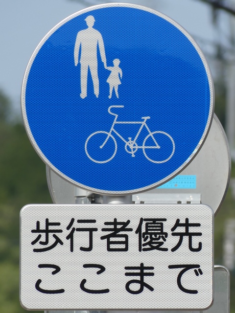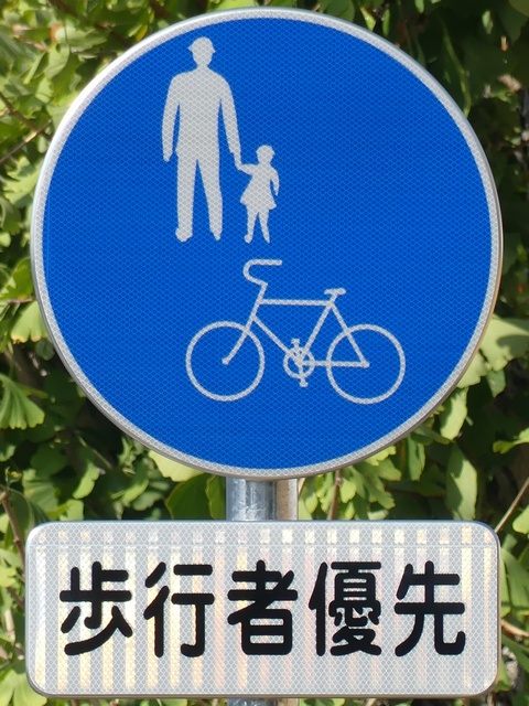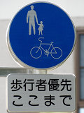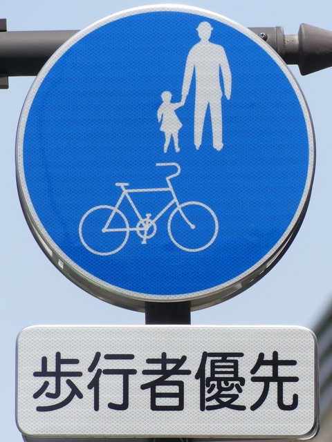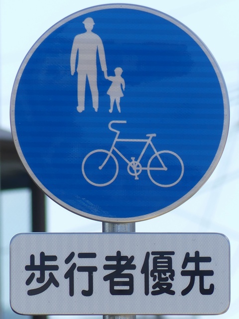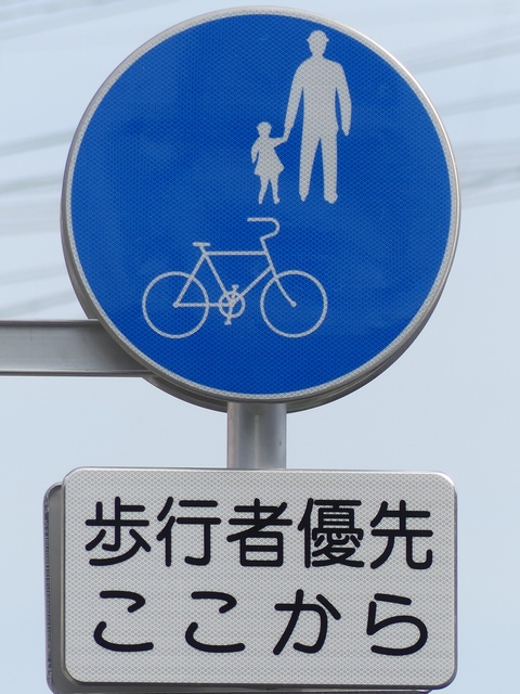 しかし、令和5年7月に特定小型原動機付自転車(特定原付)に関する法整備が行われ、補助標識の「自転車」には「特定原付」も対象に含まれることになりました。歩道を通行できるのは特定原付の中でも特例特定小型原動機付自転車(特例特定原付)に限られるため、従来の補助標識の表示では特例特定原付以外の特定原付も歩道を通行できると勘違いさせてしまうためか、令和5年度工事からは補助標識の表示が「歩行者優先」に変更されました。 昭和のころは「自転車歩道通行可」、平成に入ると「この歩道は自転車も通れます」に変更され、一部で「自転車歩道通行可」も使用されました。 この場所では、強風による道路標識の倒壊の復旧で令和5年5月に設置されました。倒壊前は補助標識が欠損していましたが、もとは「この歩道は自転車も通れます」が附置されていました。