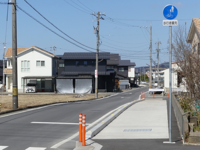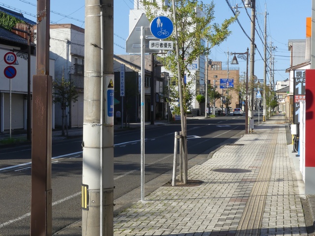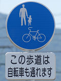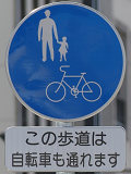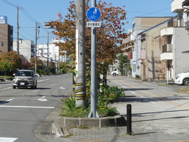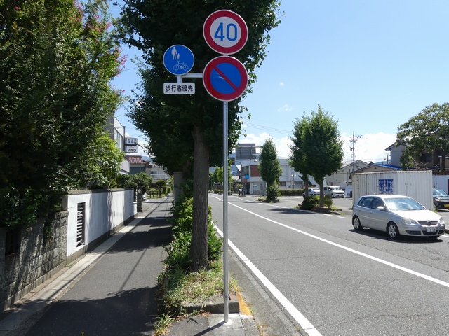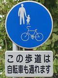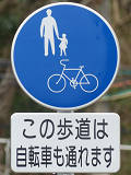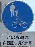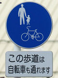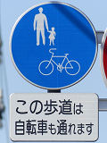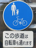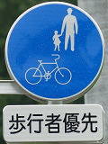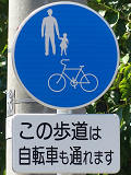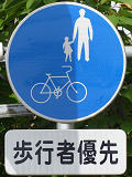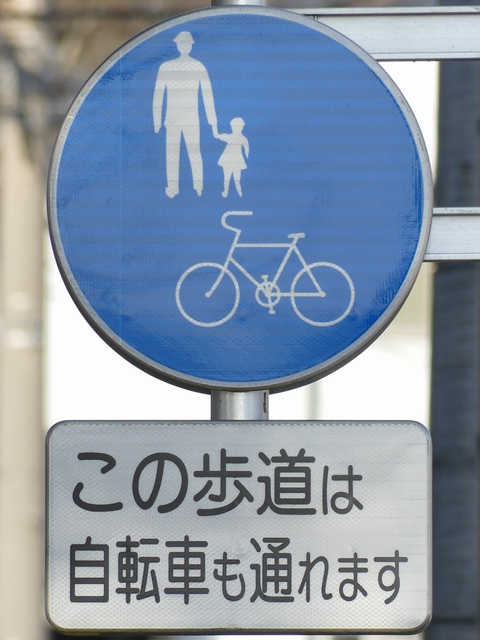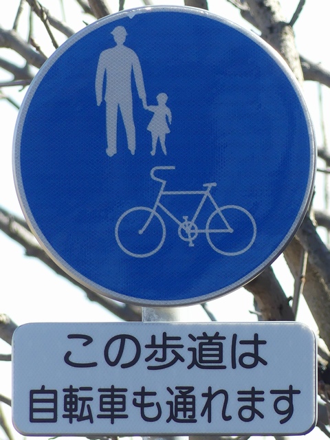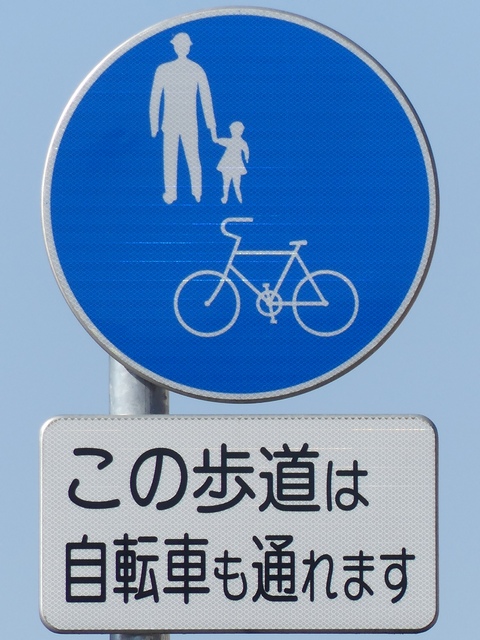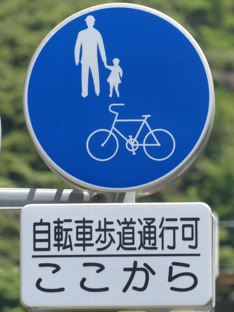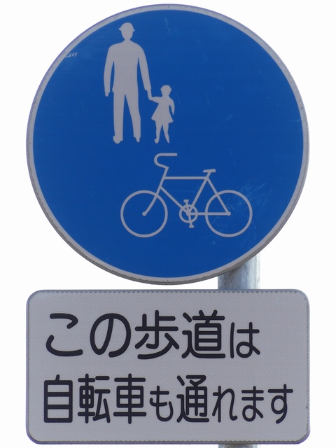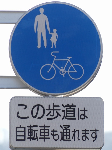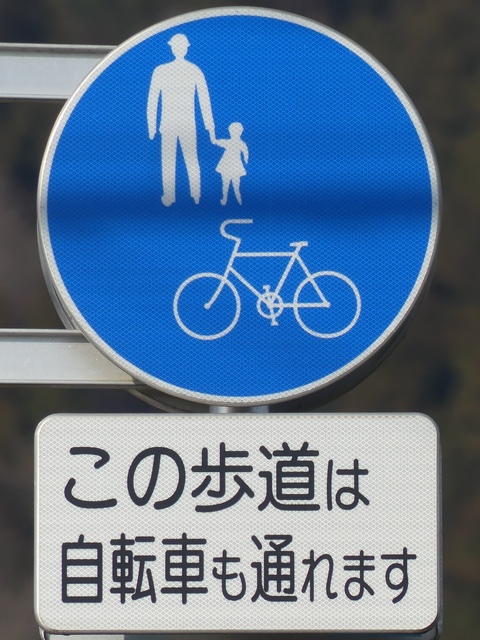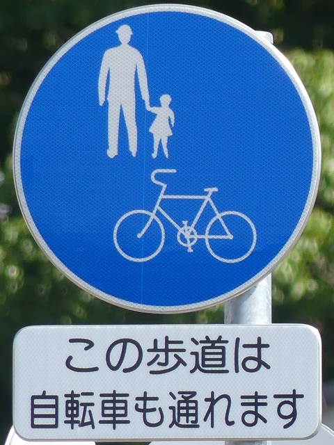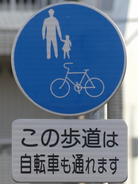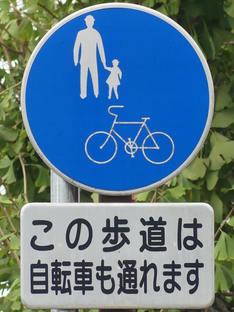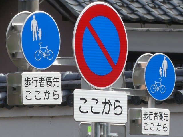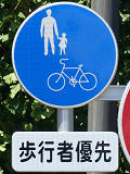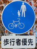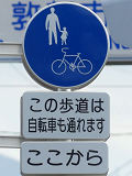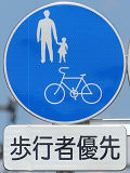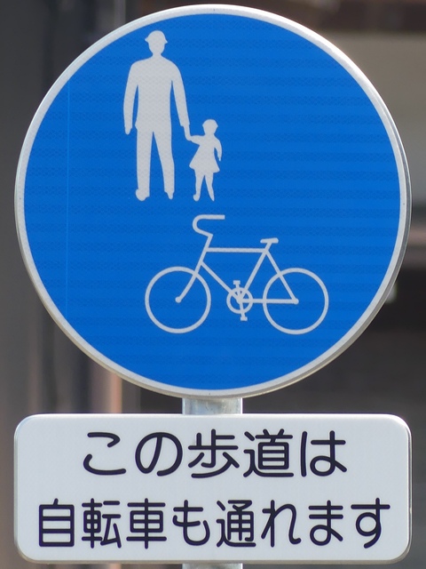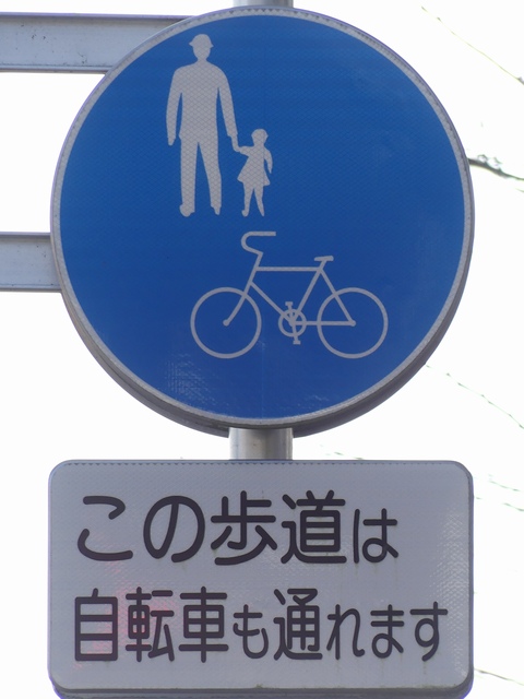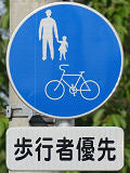 しかし、令和5年7月に特定小型原動機付自転車(特定原付)に関する法整備が行われ、補助標識の「自転車」には「特定原付」も対象に含まれることになりました。歩道を通行できるのは特定原付の中でも特例特定小型原動機付自転車(特例特定原付)に限られるため、従来の補助標識の表示では特例特定原付以外の特定原付も歩道を通行できると勘違いさせてしまうためか、令和5年度工事からは補助標識の表示が「歩行者優先」に変更されました。 昭和のころは「自転車歩道通行可」、平成に入ると「この歩道は自転車も通れます」に変更され、一部で「自転車歩道通行可」も使用されました。 この場所では、強風による道路標識の倒壊の復旧で令和5年5月に設置されました。倒壊前は補助標識が欠損していましたが、もとは「この歩道は自転車も通れます」が附置されていました。