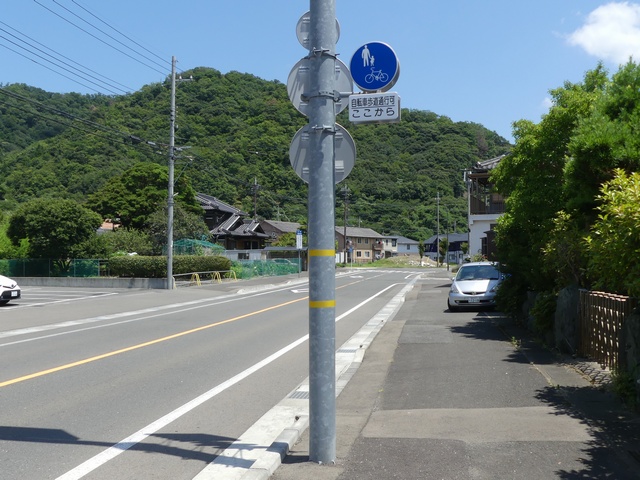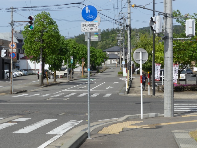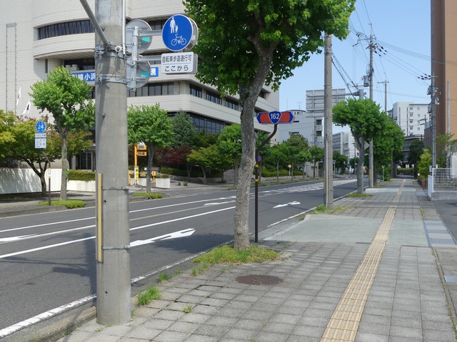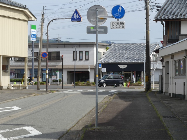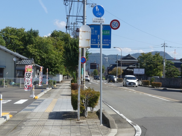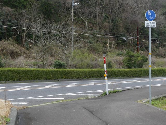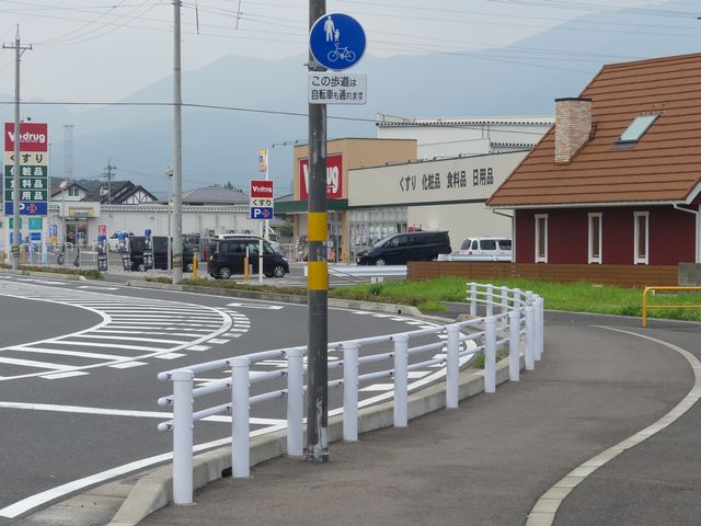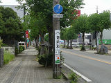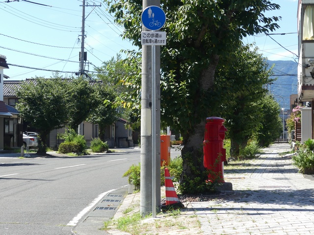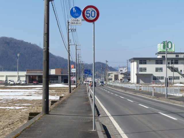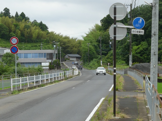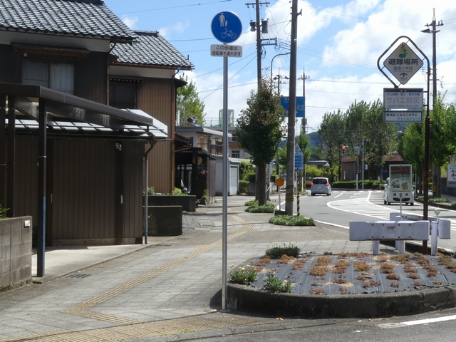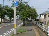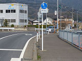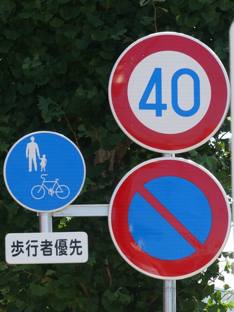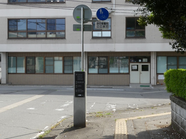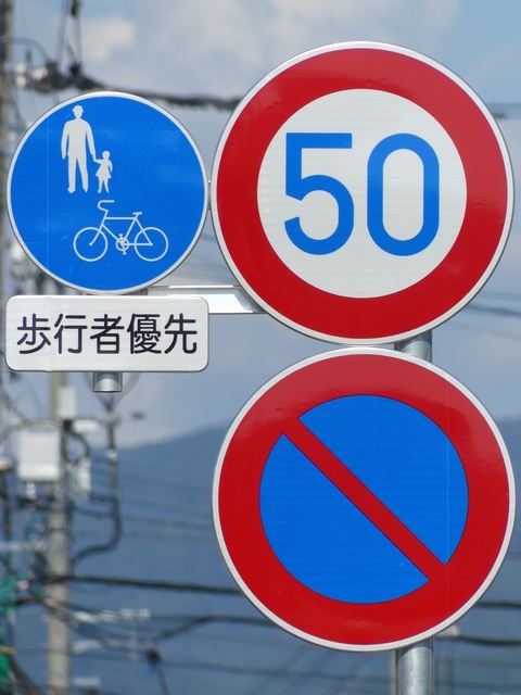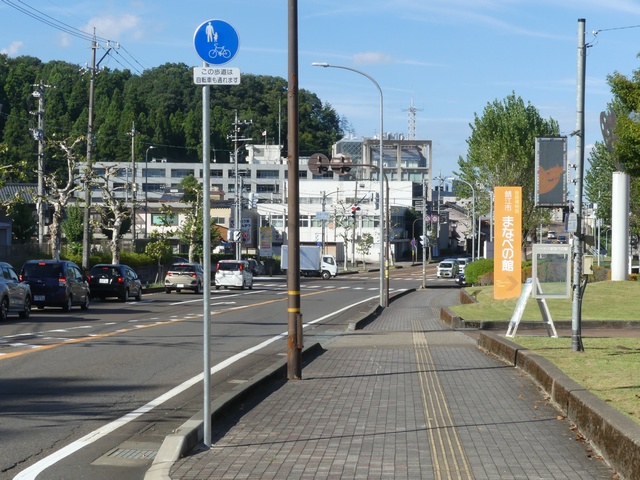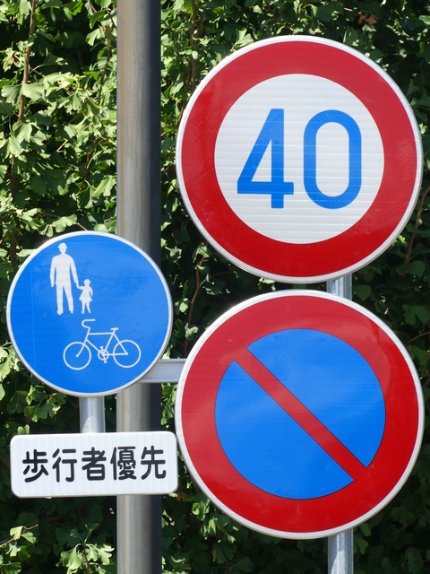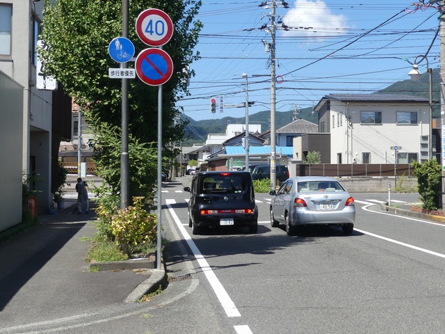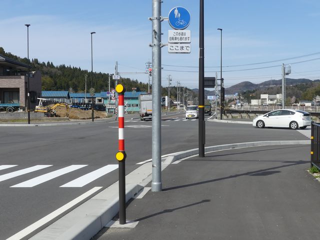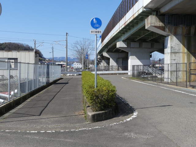 しかし、令和5年7月に特定小型原動機付自転車(特定原付)に関する法整備が行われ、補助標識の「自転車」には「特定原付」も対象に含まれることになりました。歩道を通行できるのは特定原付の中でも特例特定小型原動機付自転車(特例特定原付)に限られるため、従来の補助標識の表示では特例特定原付以外の特定原付も歩道を通行できると勘違いさせてしまうためか、令和5年度工事からは補助標識の表示が「歩行者優先」に変更されました。 昭和のころは「自転車歩道通行可」、平成に入ると「この歩道は自転車も通れます」に変更され、一部で「自転車歩道通行可」も使用されました。 この場所では、強風による道路標識の倒壊の復旧で令和5年5月に設置されました。倒壊前は補助標識が欠損していましたが、もとは「この歩道は自転車も通れます」が附置されていました。