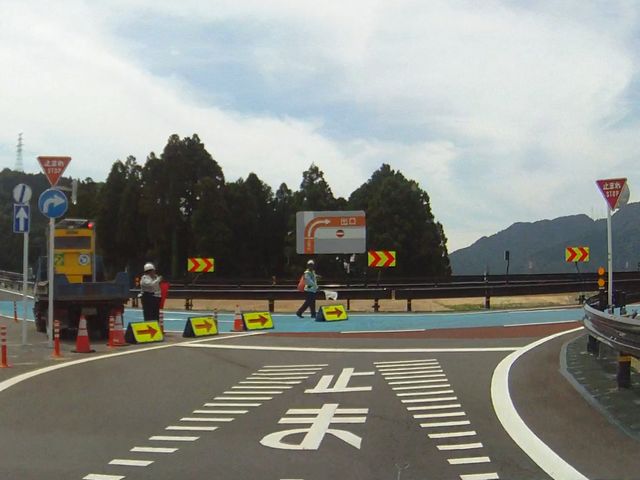 上志比ICでは、IC内で入口ランプと出口ランプが平面交差しているため「一時停止」規制が行われています。