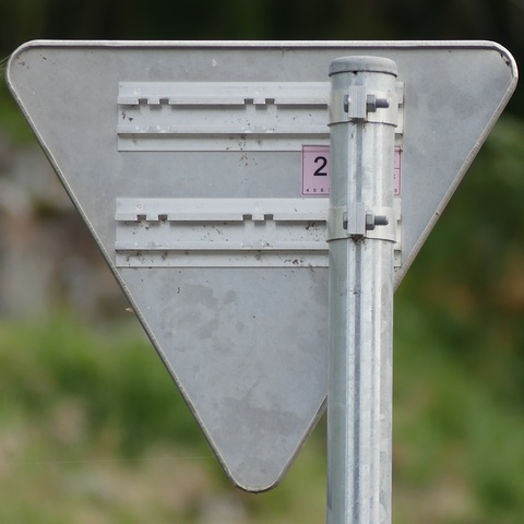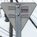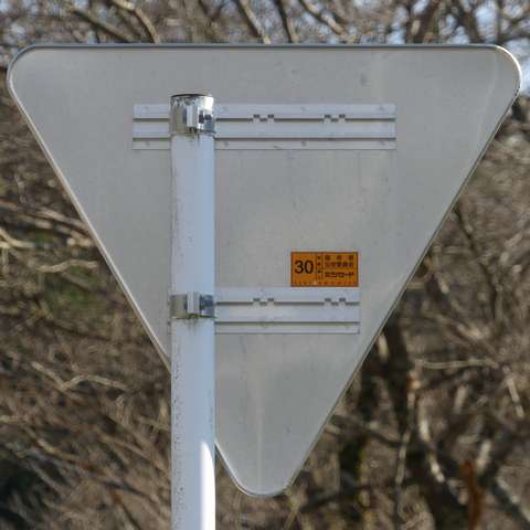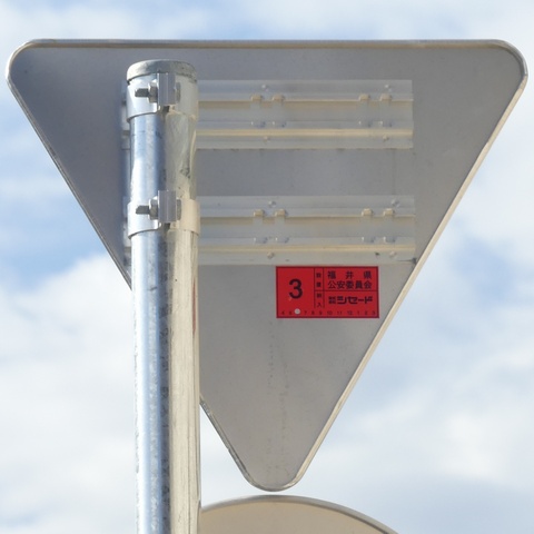 令和2年度10月設置の標識ですが、なぜか従来型の「一時停止(330-B)」標識に「STOP」の文字が追加されたものとなっています。新設や更新では、原則として「一時停止(330-A)」標識を設置することになっています。