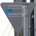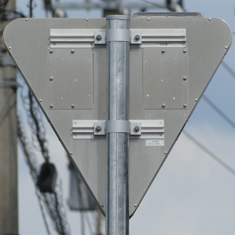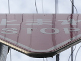 「STOP」のフォントが異なっています。吾妻商会製の自発光式標識「アレッドストップ(ALED800ST II)」と思われ、カタログ掲載がこのフォントのものです。