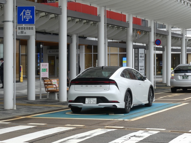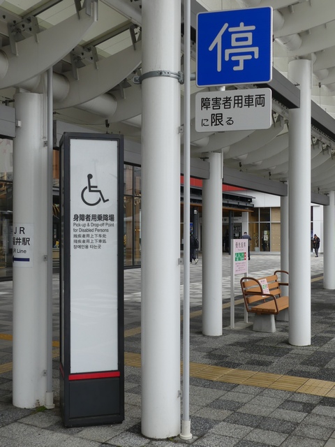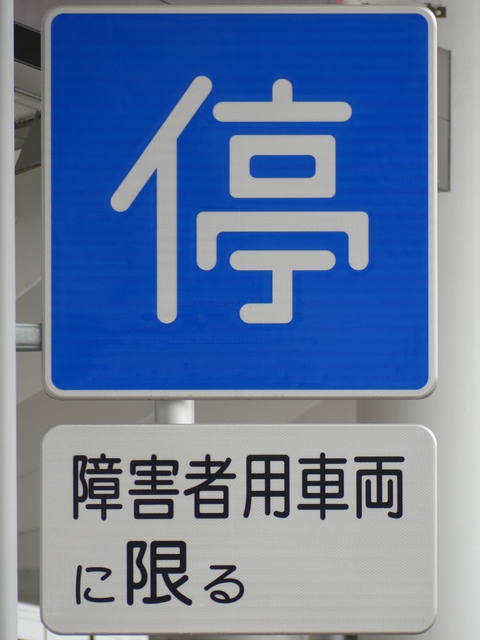 道路標識による駐車関係の規制は「駐車禁止」の区間規制のみで、一見、停車は禁止されていないように見えますが、横断歩道から5m以内の場所であり法定駐停車禁止場所です。停車枠は横断歩道から1mほどしか離れていません。全車両対象の一方通行路であり、横断歩道の先に停車車両があっても問題ないと判断したのでしょう。 停車が認められるのは障害者用車両のみです。特に「障害者用車両」の定義はないようなので、障害者が乗降する、又は運転している車両であればよさそうです。 ただ、撮影時には無人の自動車が少なくとも30分以上駐車していました。その車両がいなくなった後は、すぐに迎え待ちの自動車が駐車していました。障害者用車両かどうかにかかわらず駐車禁止違反です。 なお、この身障者用乗降場は2018年ごろから運用されていましたが、「停車可」標識が設置されたのは2026年4月であり、しばらくは違法駐停車が黙認されていたようです。