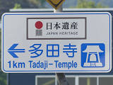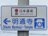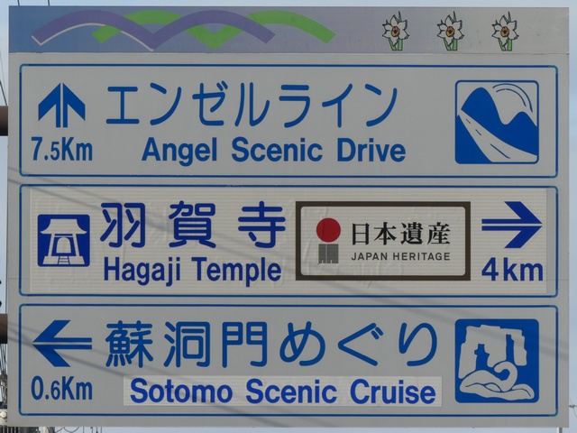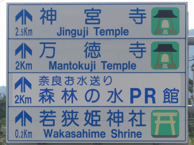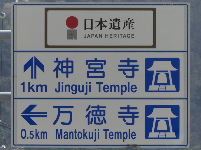 更新前は同じ内容の旧型の「著名地点」標識が設置されており、東進用は「重文」と併記されていました。西進用は「重文」の併記、距離の表示がなく、縦幅の狭いものでしたが、更新後もそのまま引き継がれています。現行の「著名地点」標識に更新されたことにより、矢印の配置が変わり、また寺院の記号が入るなどし、文字が小さくなりました。