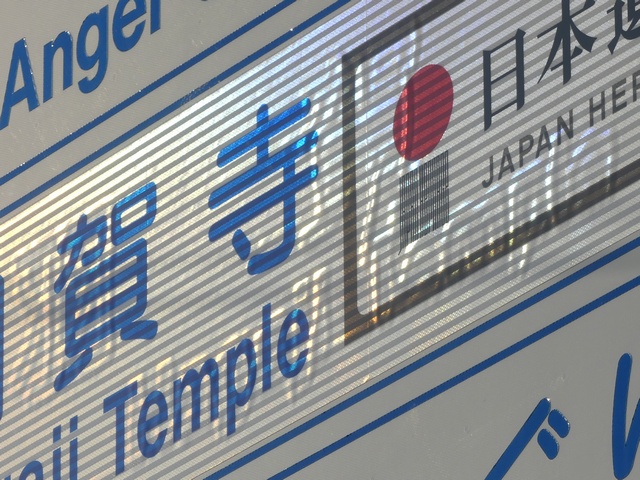 既存の標識にシートを貼って表示を更新しています。既存の標識にあった「奈良お水送り森林の水PR館」の表示を削除し、すべてを日本遺産の施設とすることで、一番上に「日本遺産」の表示を追加しています。