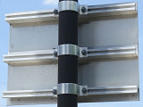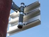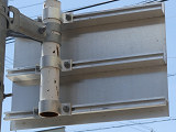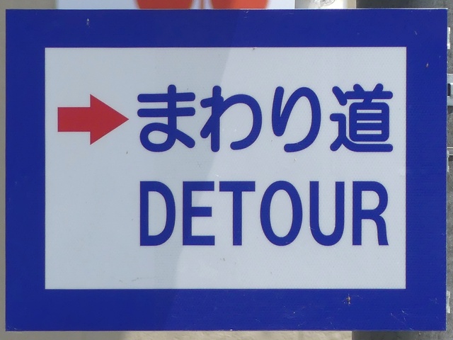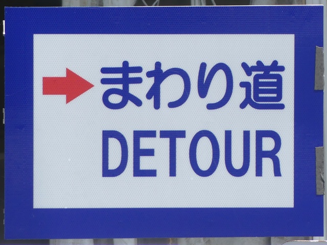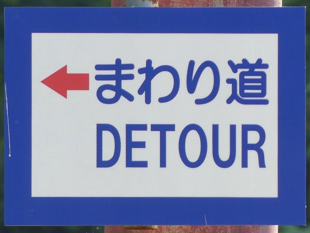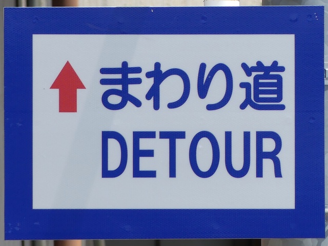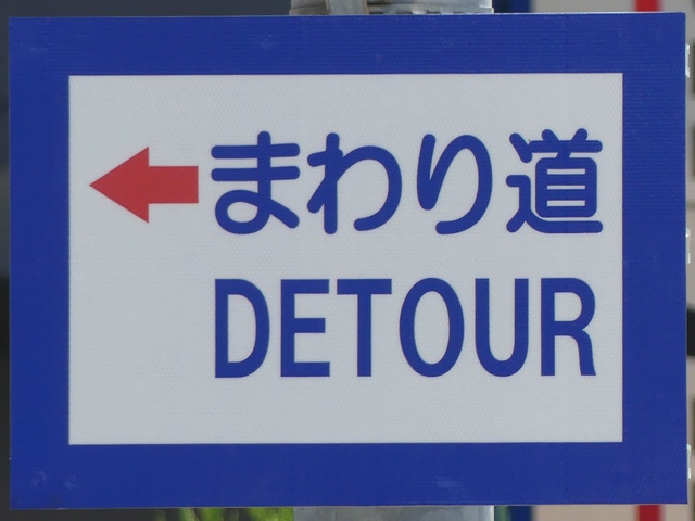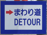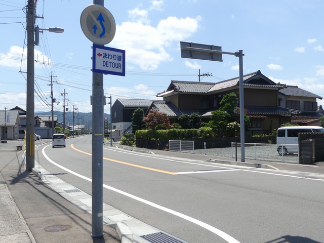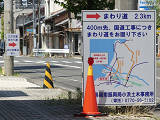 R162西津橋、大手橋の架け替え工事に伴う迂回路の案内です。約5年間という長い期間になるため、しっかりとした「まわり道(120-A)」標識が設置されています。迂回路に入る交差点の手前で案内看板により案内を行い、実際に右左折を行う交差点に「まわり道(120-A)」標識を設置しています。