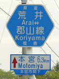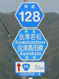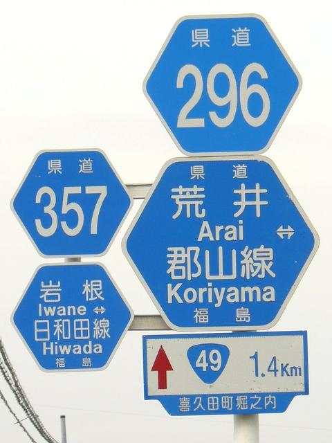 福島県の「都道府県道番号」標識は2弾重ねの特殊なものが設置されています。上の標識には路線番号、下の標識には路線名が書かれています。補助標識は、この先の主要な地点までの距離が書かれており、その下に地名が小さく書かれています。個人的には他県のように路線番号と地名をメインに表示したほうが分かりやすいと思います。