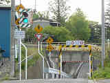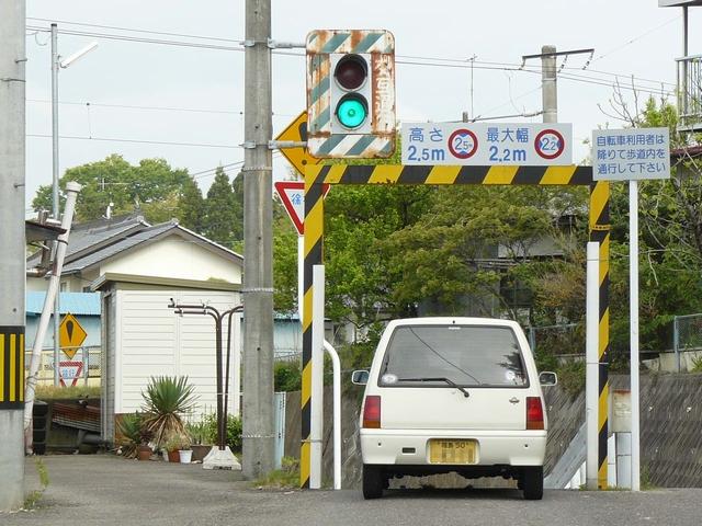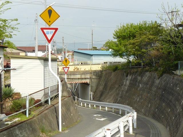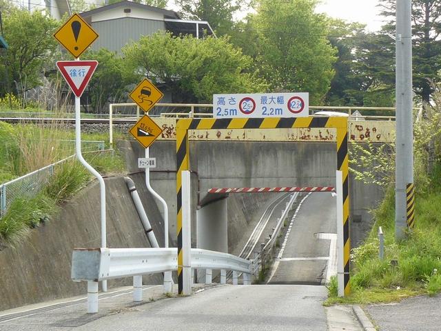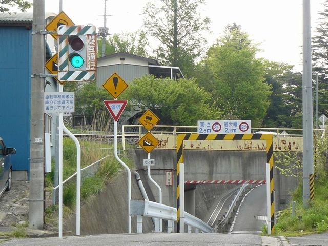 鉄道ガード下で、急坂、急カーブで見通しがが悪いうえに、車道幅が狭く、クルマのすれ違いができないため、信号による「交互通行」になっています。
