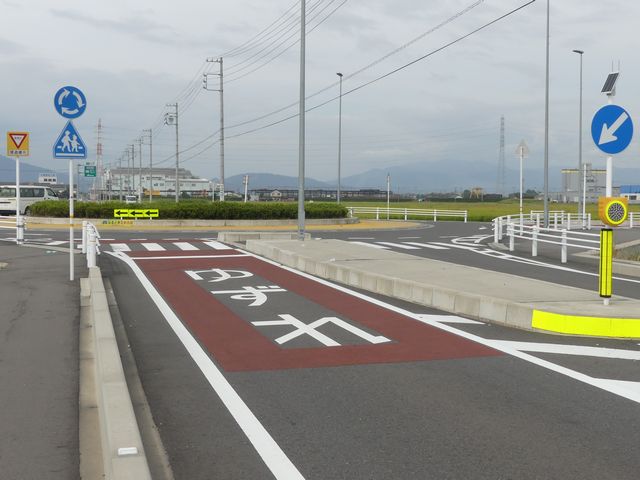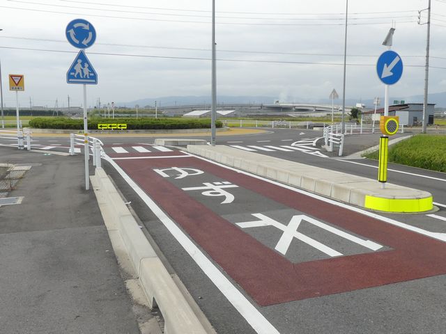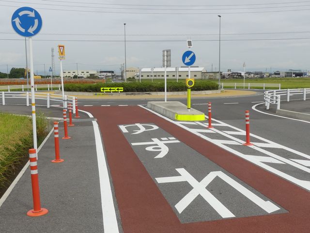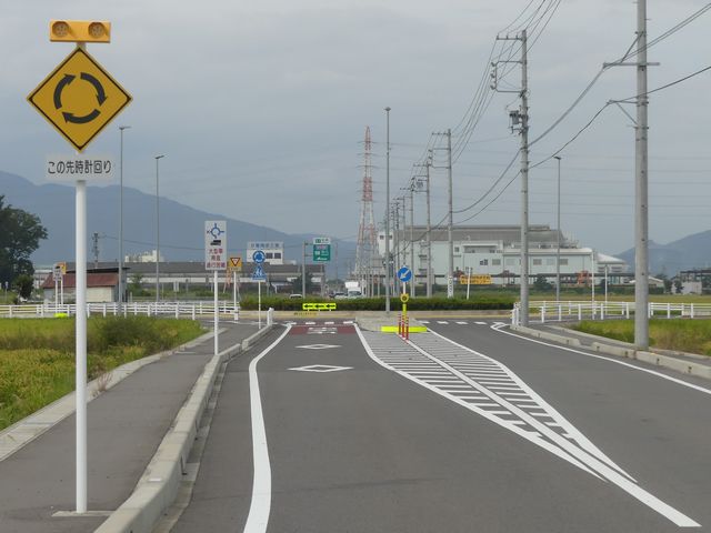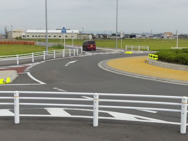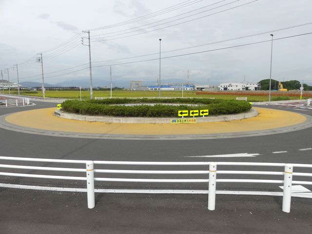 幹線道路とスマートICを結ぶ町道と町道の交差点に整備された環状交差点(2018年3月24日供用開始)です。田園地帯の交差点で、通常の十字路ではコリジョンコース現象による事故が発生しそうな場所です。