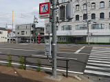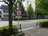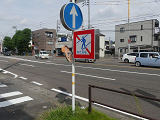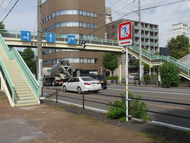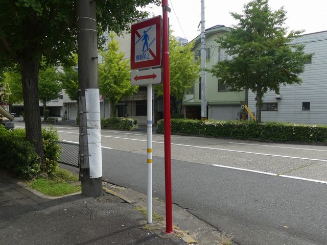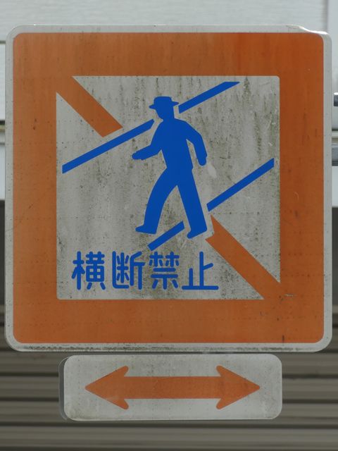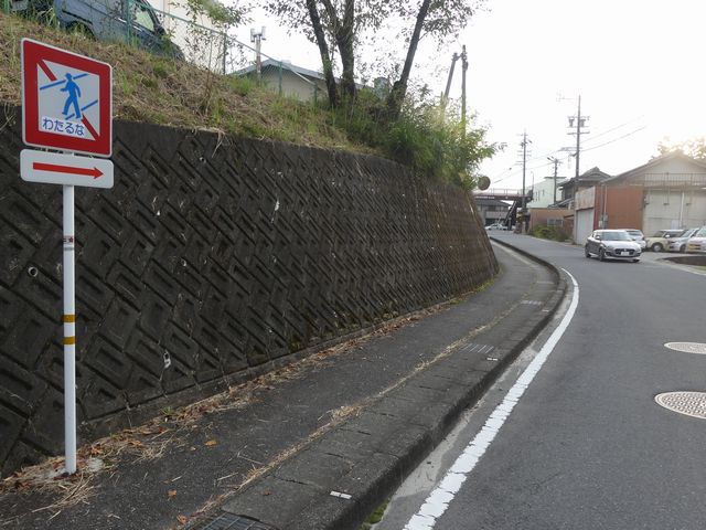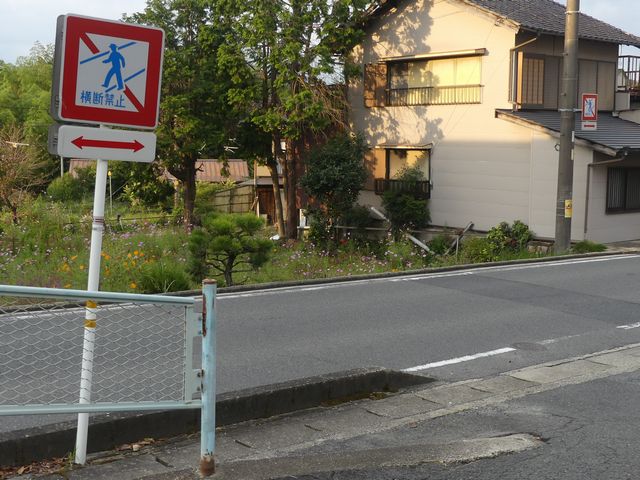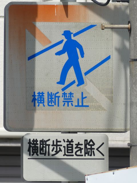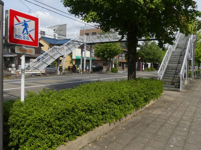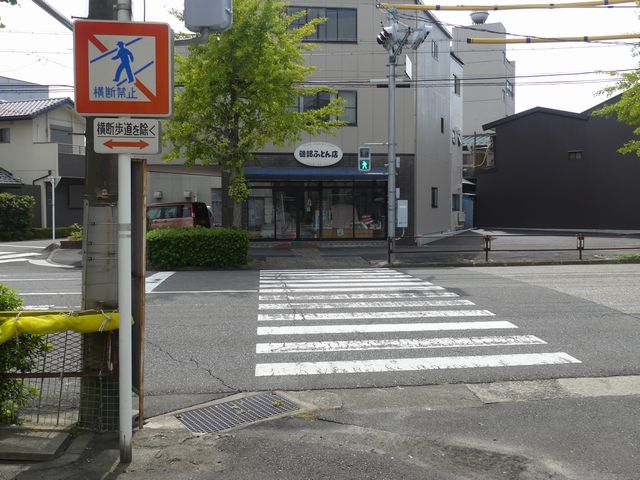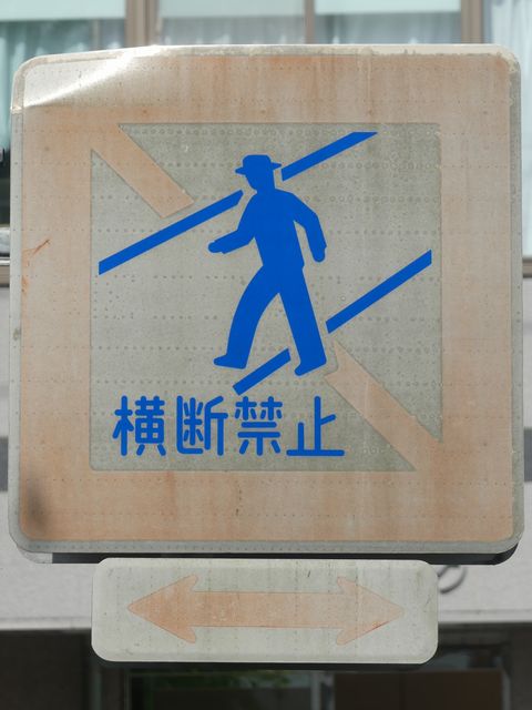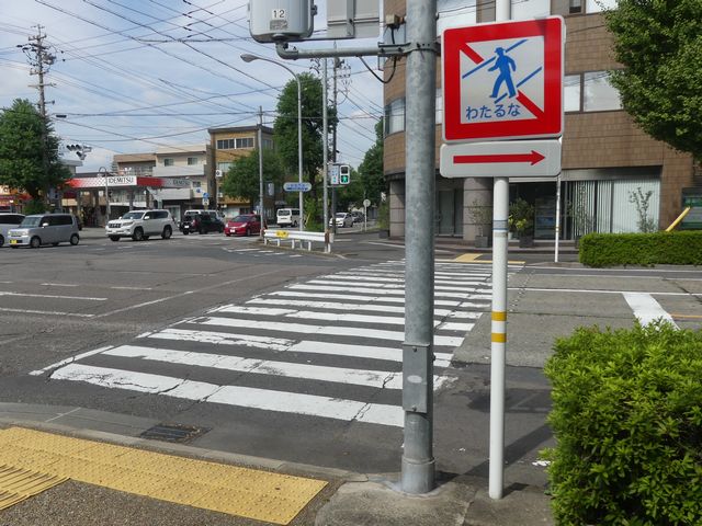ここは小学校の前の交通量の多い県道で歩道橋があり、中央線のない道路としては珍しく「歩行者横断禁止」規制が行われています。もともとあった標識9枚のうち5枚の「横断禁止」の表示に「わたるな」のシールが貼られました。標識の位置が高いものや標識柱が傾いているものは変更されなかったようです。令和2年8月3日に変更され、「わたるな」表示は県内で初めての採用とのことです。