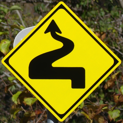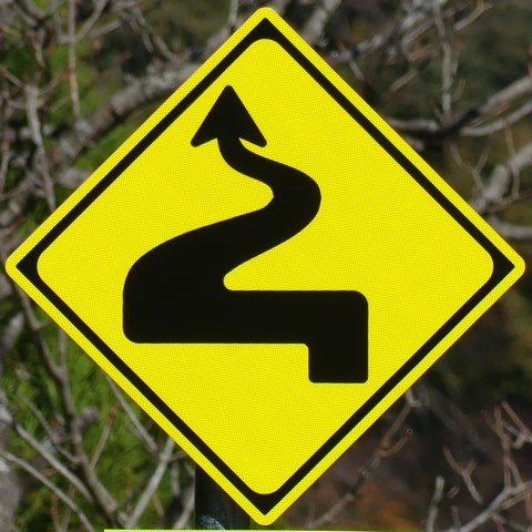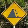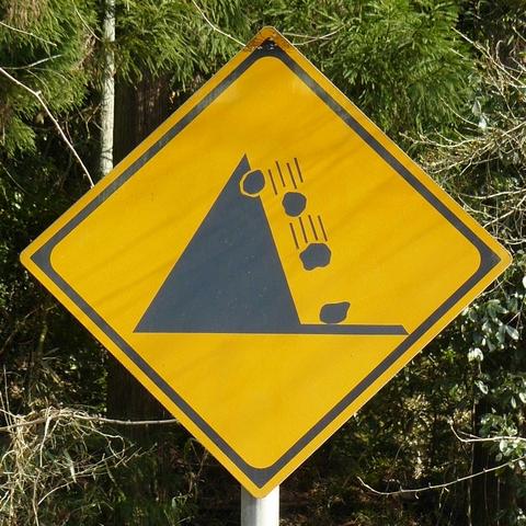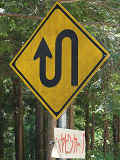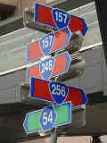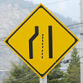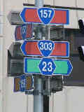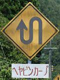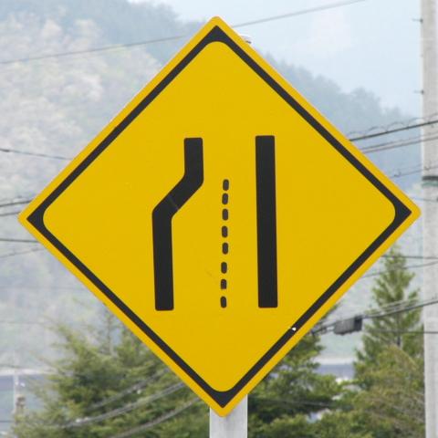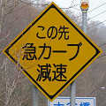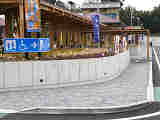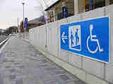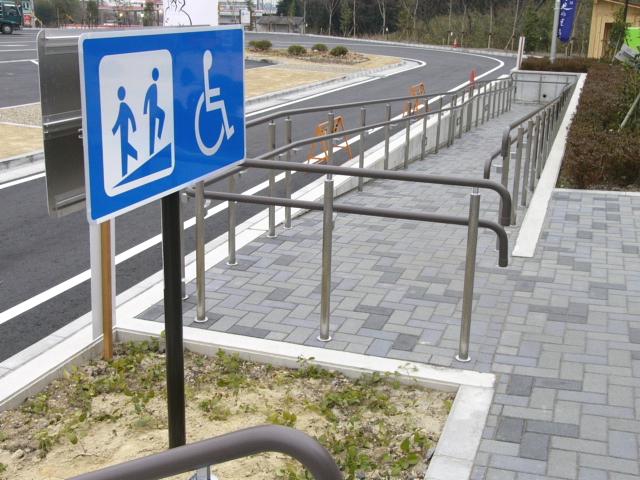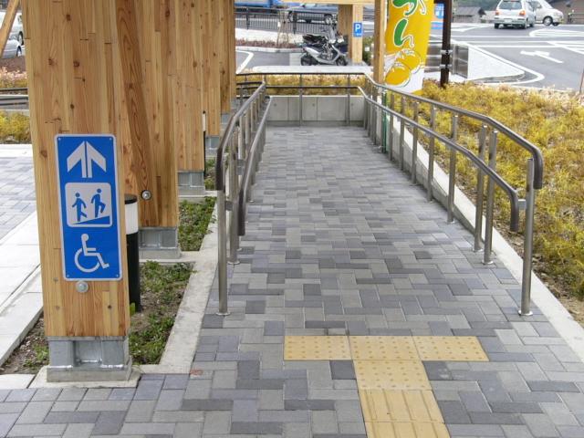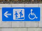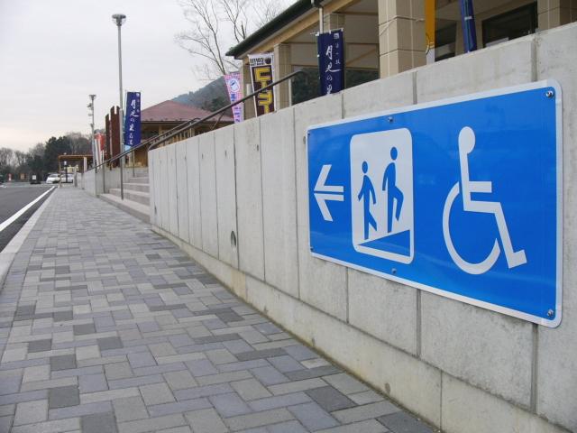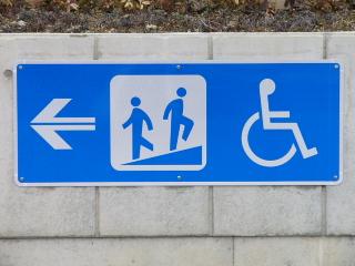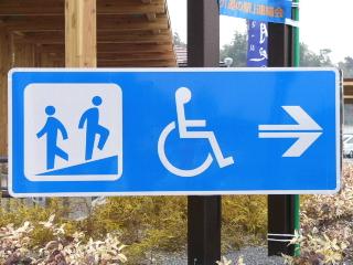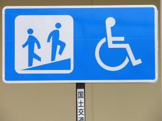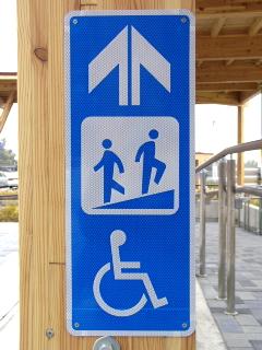 標識の様式は国土交通省令で定められていますが、国土交通省により設置されたこの標識はそれに反し傾斜路の記号の部分と矢印の部分の色を反転させてあります。 |