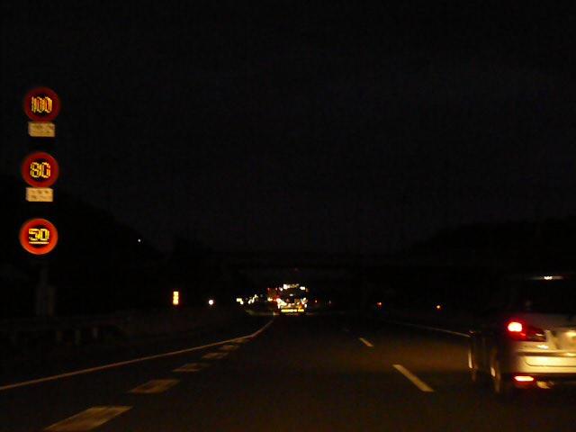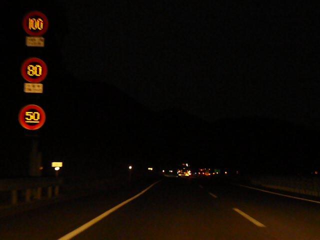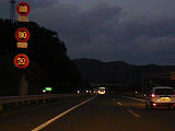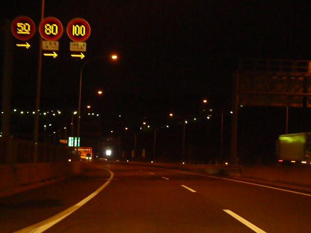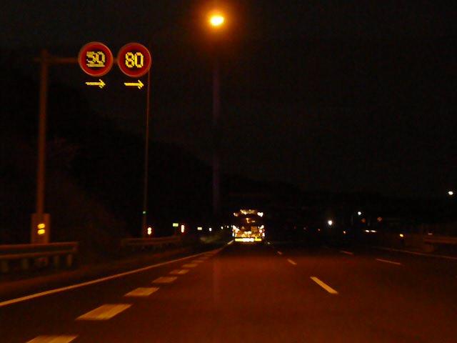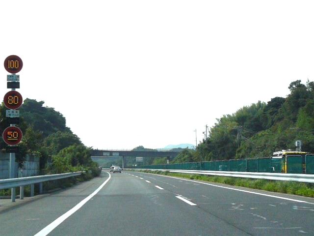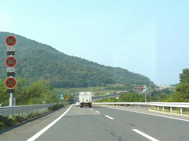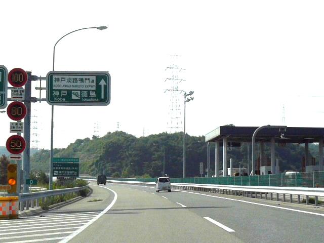 一部の区間では「特定の種類の車両の最高速度」規制により「大貨等・三輪・けん引」が80キロ、それ以外の車両が100キロ規制されています。また、その区間を含む一部の区間では「最低速度」50キロとなっています(高速自動車国道で標識による規制がない場合と同じ)。いずれも悪天候時や異常時に規制変更できるように可変標識となっていますが、「最低速度」の区間の終わりだけは非可変標識となっています。 なお、以前は80キロのほうが「大貨等・普通(三輪・けん引)」、100キロのほうが「バス・自二輪・普通(三輪・けん引を除く)」となっていましたが平成19年6月2日の法令改正(中型区分の新設)により「普通」の範囲が変更になったため、現在の表示に変更されました。 (下り) 神戸西IC ↓ 最高100キロ(大貨等等を除く)、最高80キロ(大貨等等)、最低50キロ 垂水JCT・IC ↓ 最高80キロ、最低50キロ 淡路IC ↓ 最高100キロ(大貨等等を除く)、最高80キロ(大貨等等)、最低50キロ 西淡三原IC ↓ 最高80キロ、最低なし 淡路島南IC ↓ 最高70キロ、最低なし 鳴門北IC ↓ 最高80キロ、最低なし 鳴門IC ※大貨等等=大貨等・三輪・けん引 ※料金所手前を除く。悪天候時、異常時は規制変更あり。 ※画像は車載動画からのキャプチャー画像です。