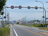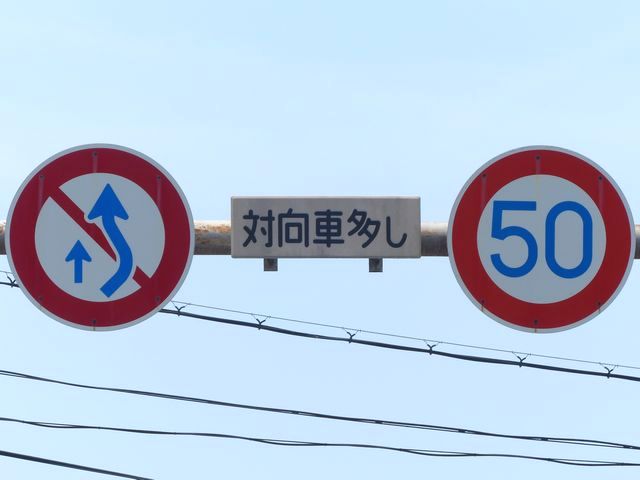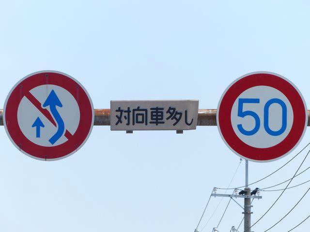 法令で例示されている「対向車多し」です。オーバーヘッド式の2枚の本標識の間に設置されています。