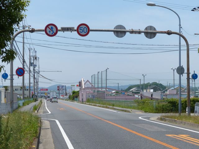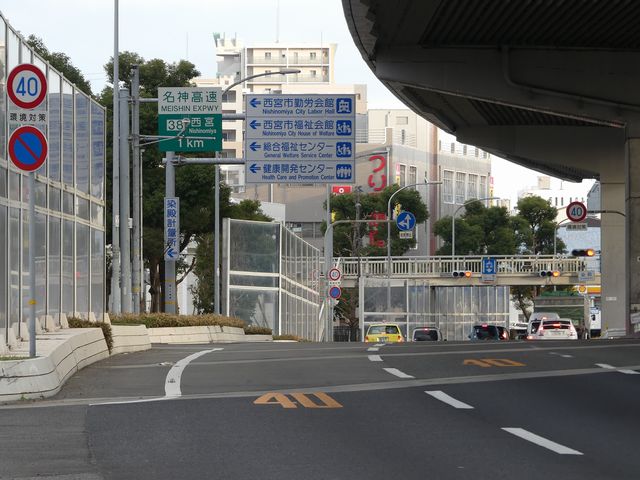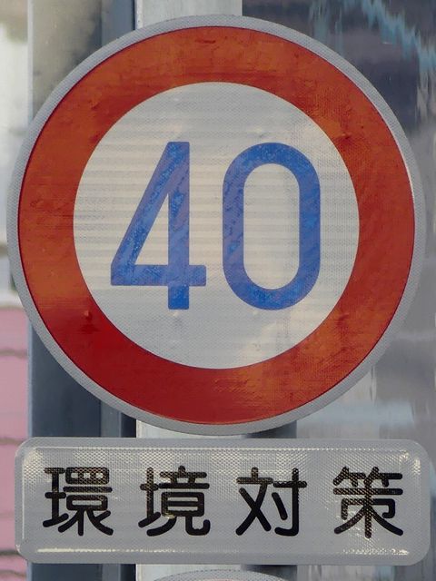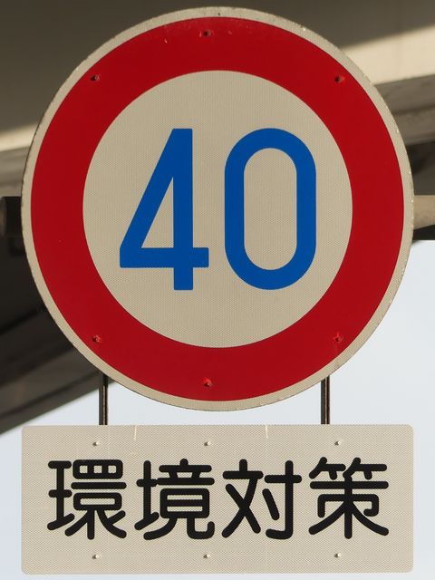国道43号は、片側3車線でスピードの出やすい道路ですが40キロ規制が行われています。「環境対策」の補助標識を附置することで、その規制が単なる安全対策ではなく騒音や振動対策であることを明らかにしています。