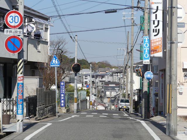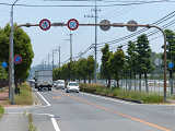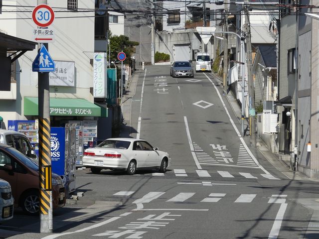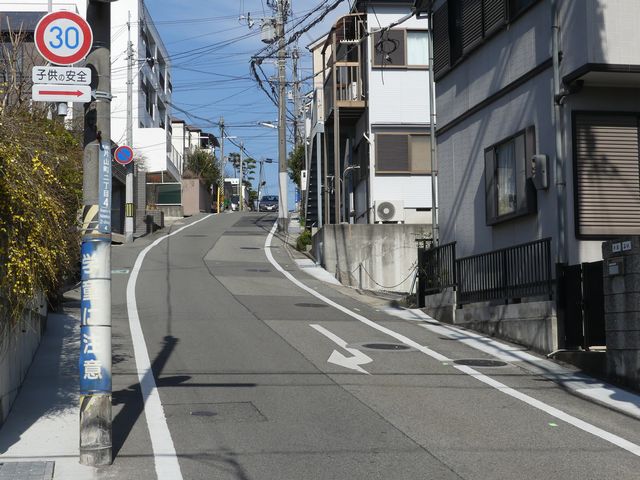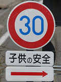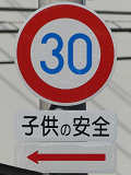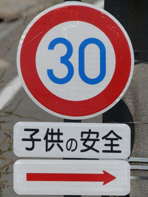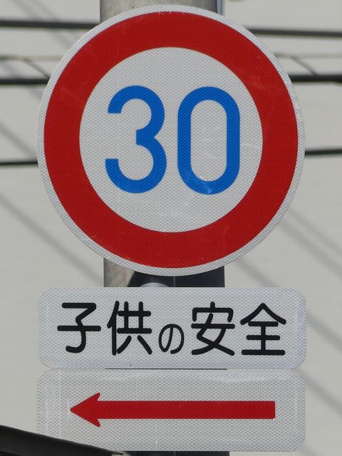 ここでは住宅地域の中央線のない道路で30キロ規制が行われています。道路環境から見れば妥当な規制であり、規制理由の補助標識は不要のような気がしますが、通り抜け車両が多いためあえて附置しているのでしょう。
