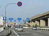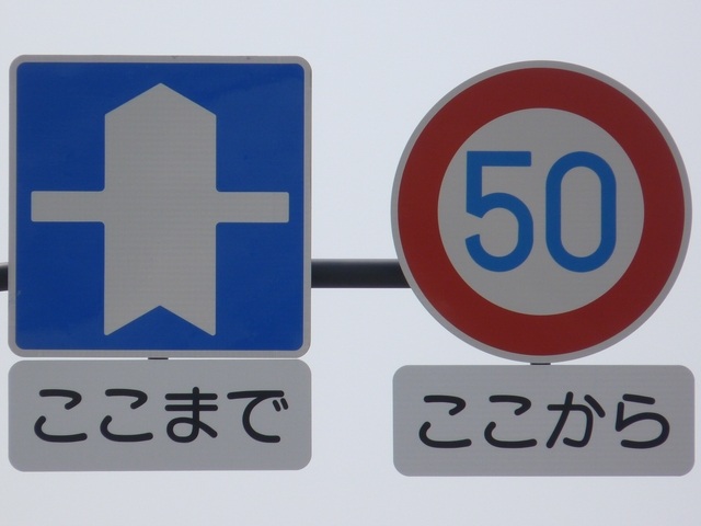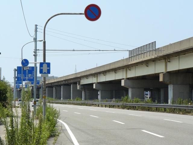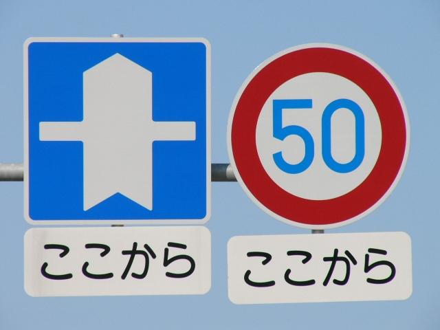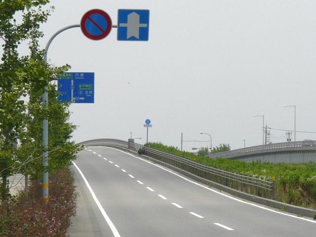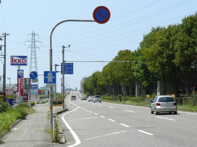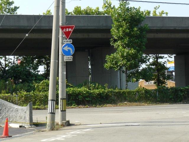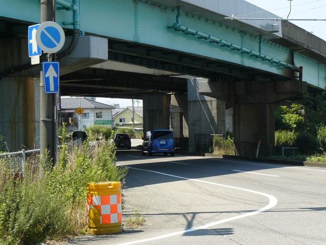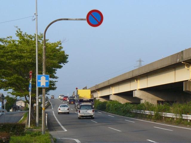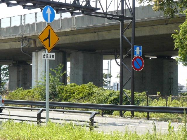 こちらも高速道路出口のランプ道路が標識による優先道路に合流する箇所ですが、「前方優先道路」標識ではなく「徐行」標識が設置されています。補助標識が欠落したような形跡がないため、もともと補助標識は無かったようです。合流直後は進路変更禁止規制が実施されていて、優先道路かどうかはあまり関係がない状態だからでしょう。