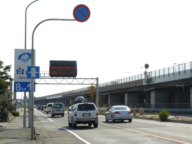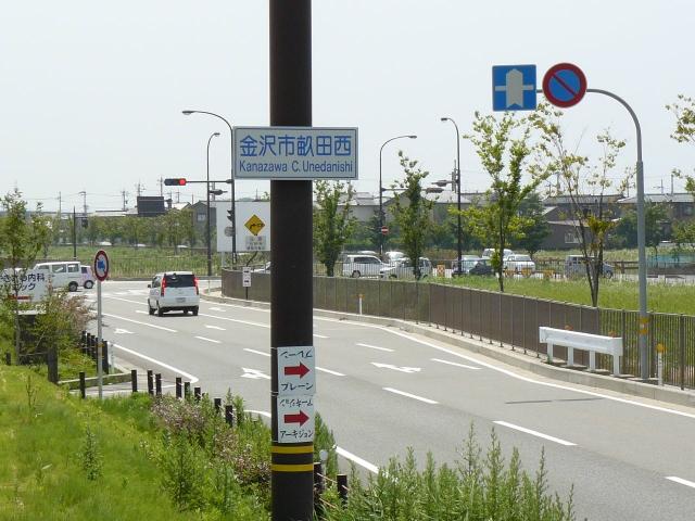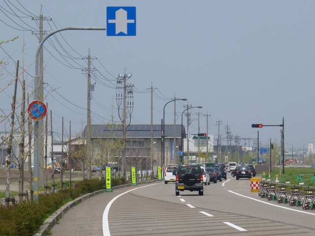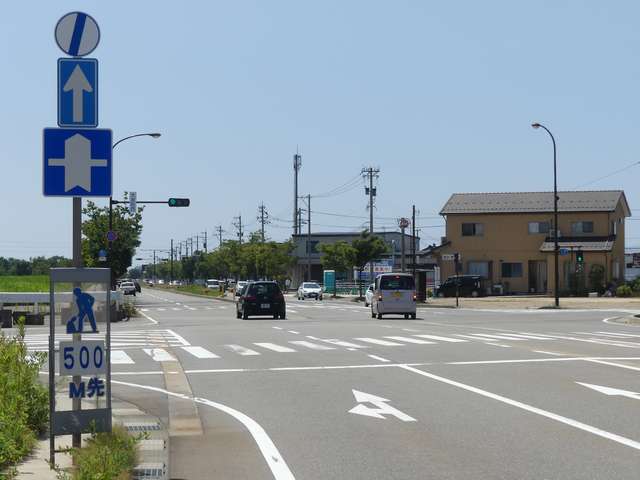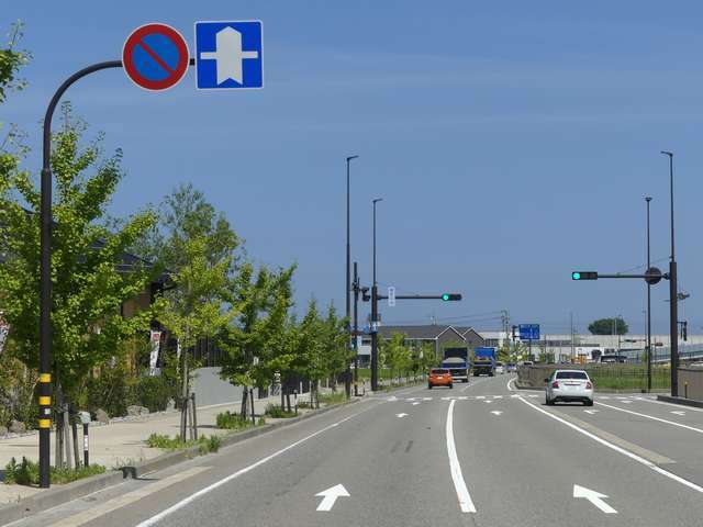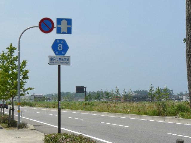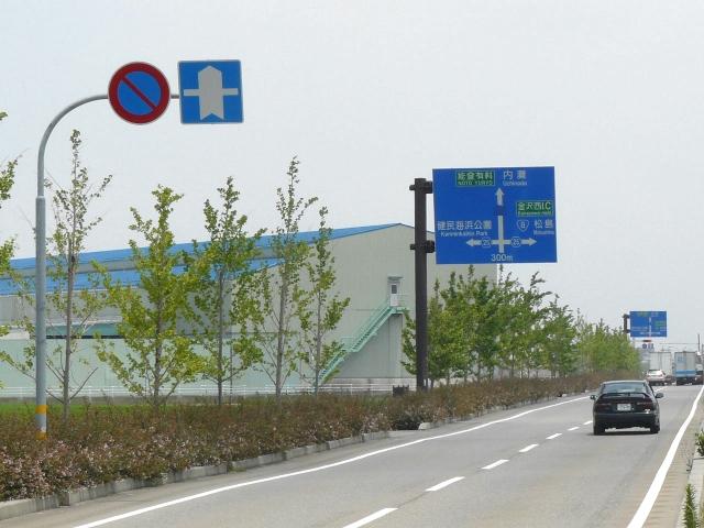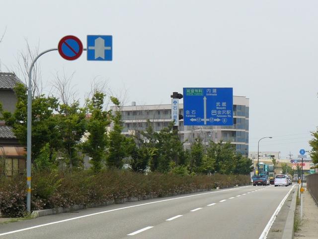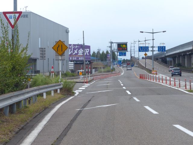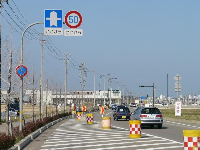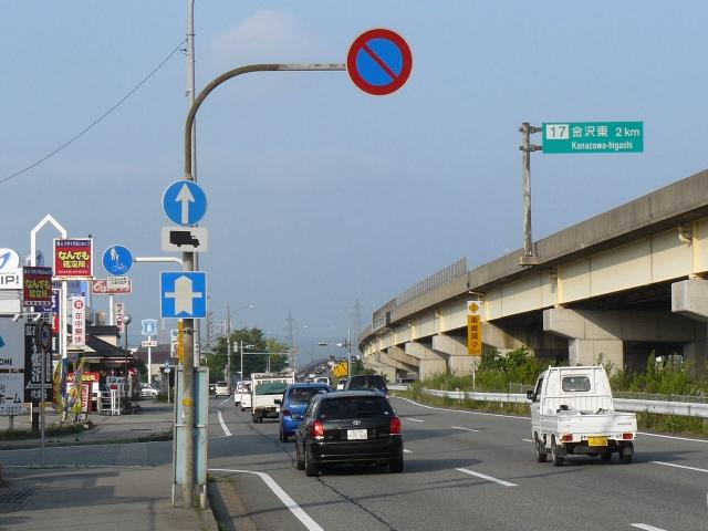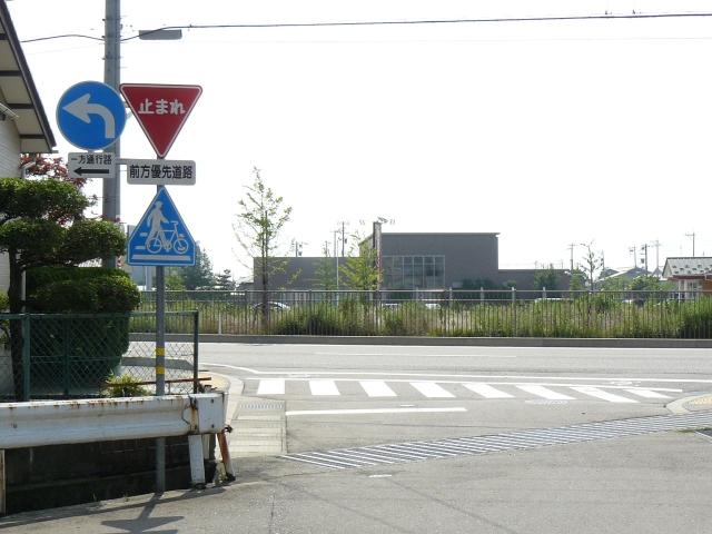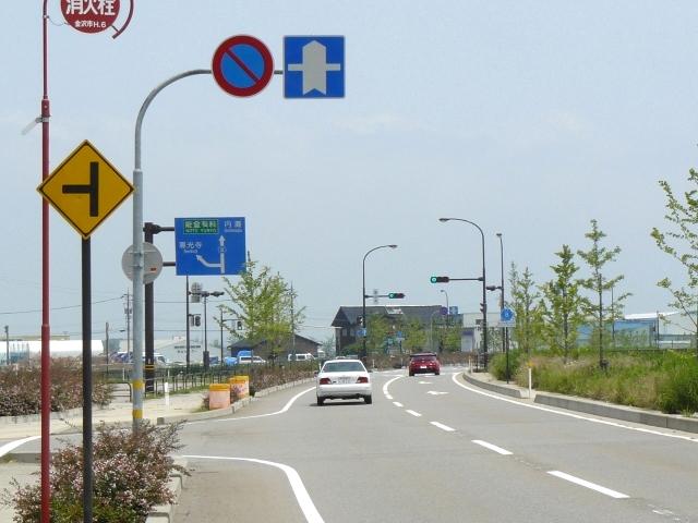 2012年4月に北陸自動車道白山IC開通と同時に金沢外環状道路海側幹線「福増町南」交差点以南が開通し、上下線分離区間が白山市あさひ荘苑付近まで延伸されたのに伴い、「優先道路」の指定区間も同所まで延長されました。既開通区間では区間内のほぼ信号交差点ごとに「優先道路」標識が設置されていましたが、今回の開通区間では、信号のない交差点の手前のみの最小限の設置となっています。なお区間内は、通行帯が2以上あり「車両通行帯」の道路標示が交差点内まで設置されているため、「優先道路」標識を設置しなくても優先道路となっています。