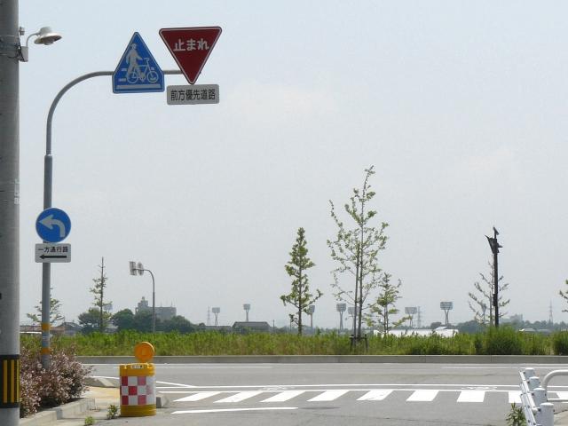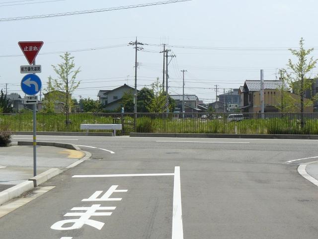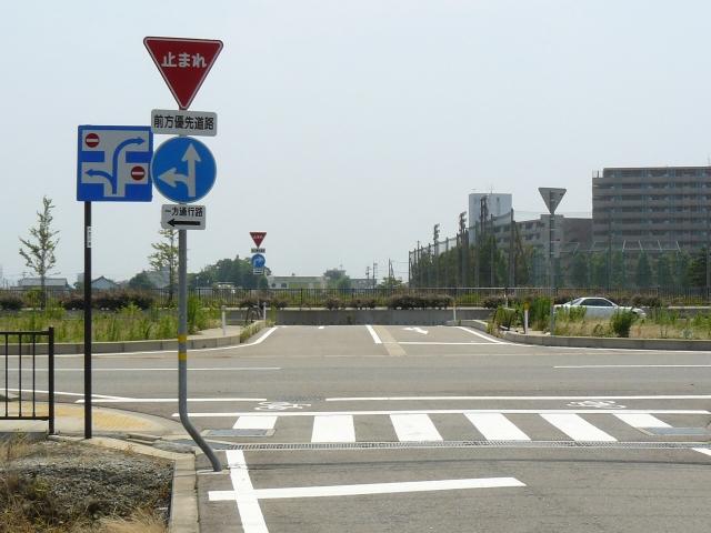 「前方優先道路・一時停止」標識廃止後の開通のため、交差道路には「一時停止」標識が設置されています。「前方優先道路」道路標示は設置されていません。