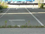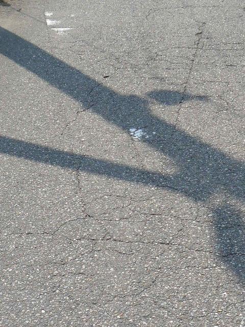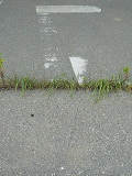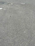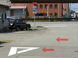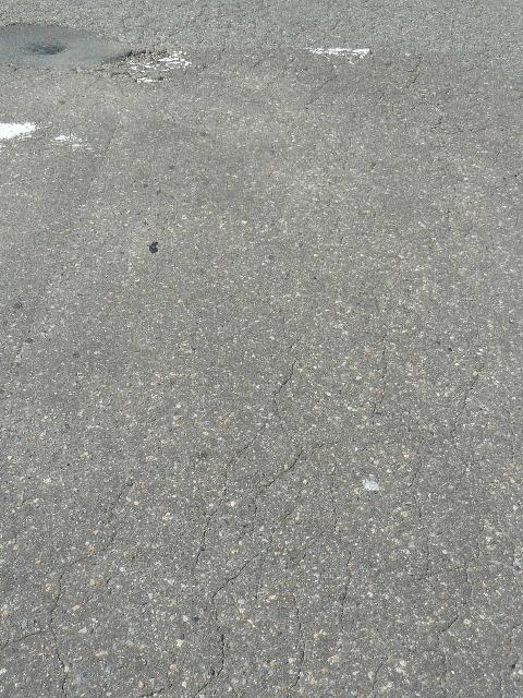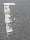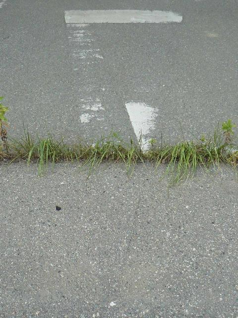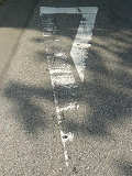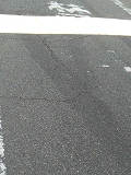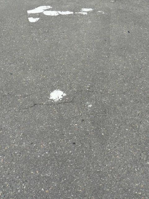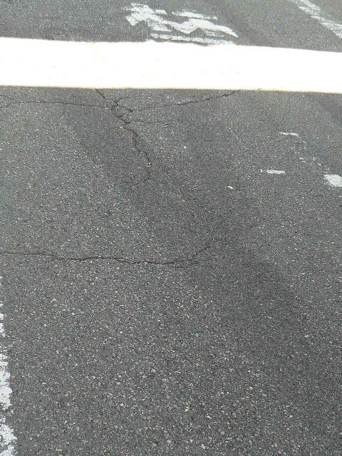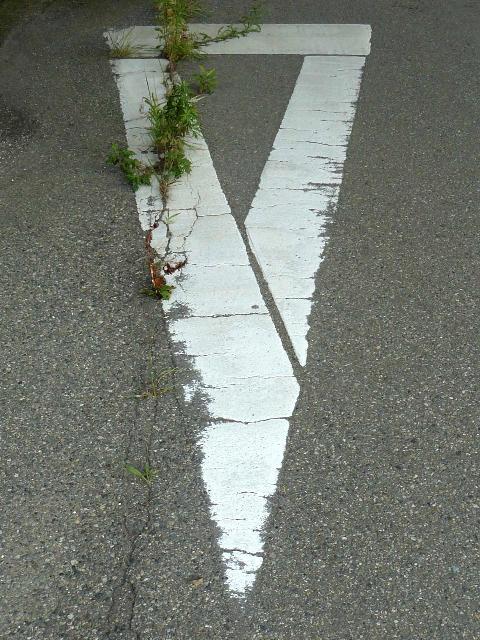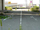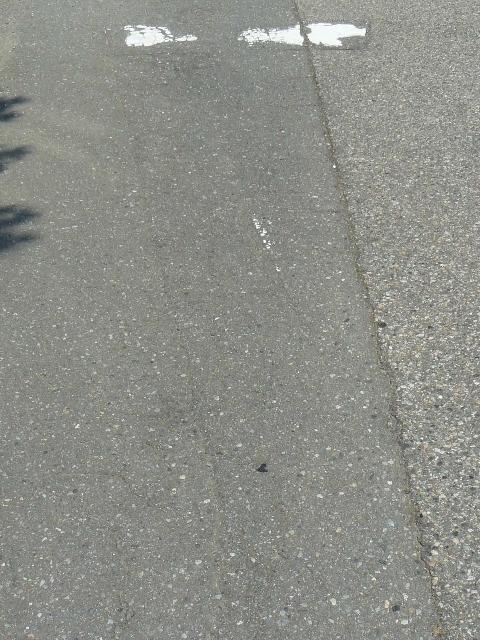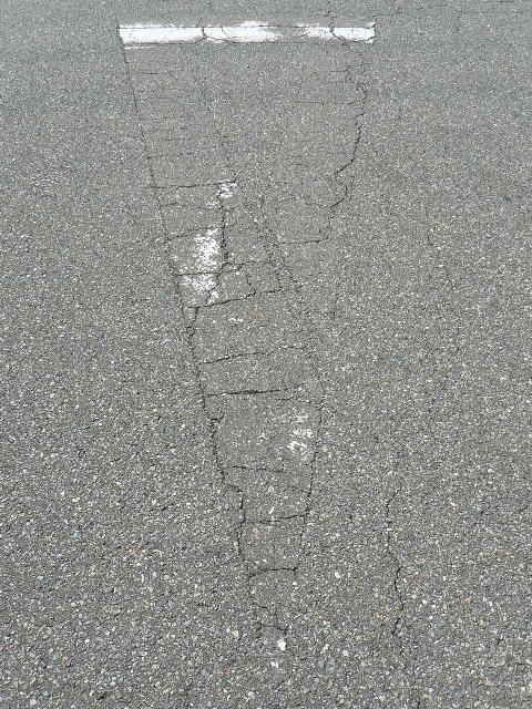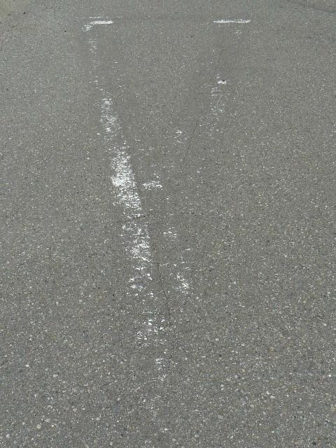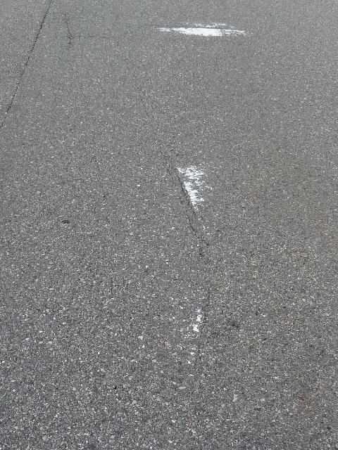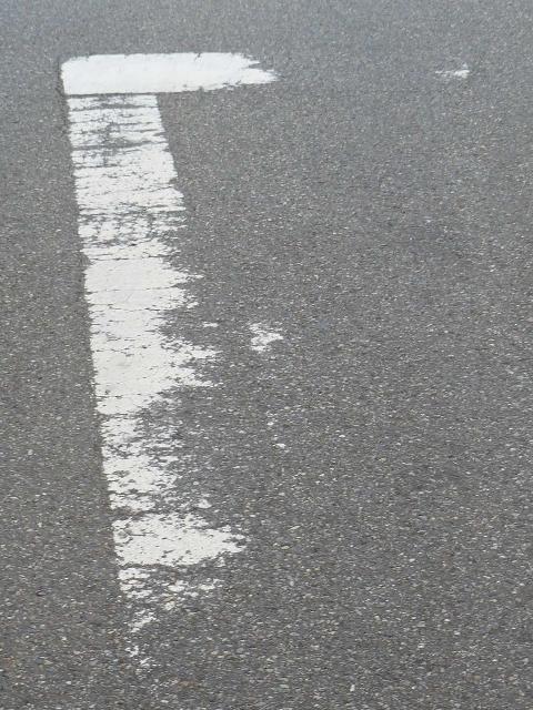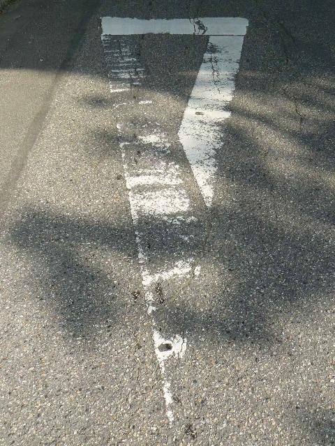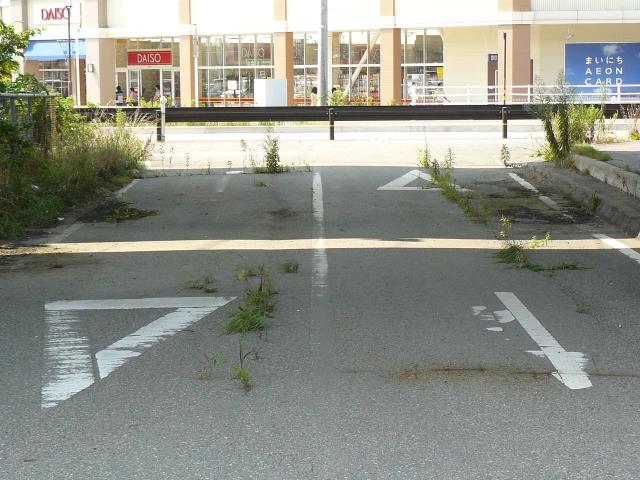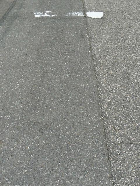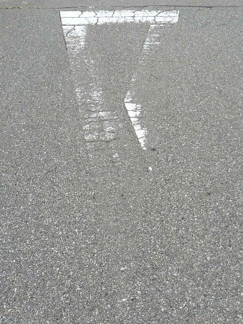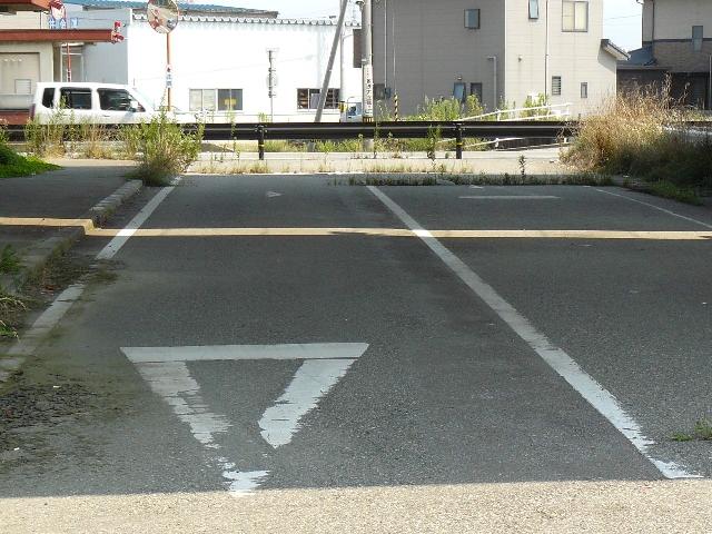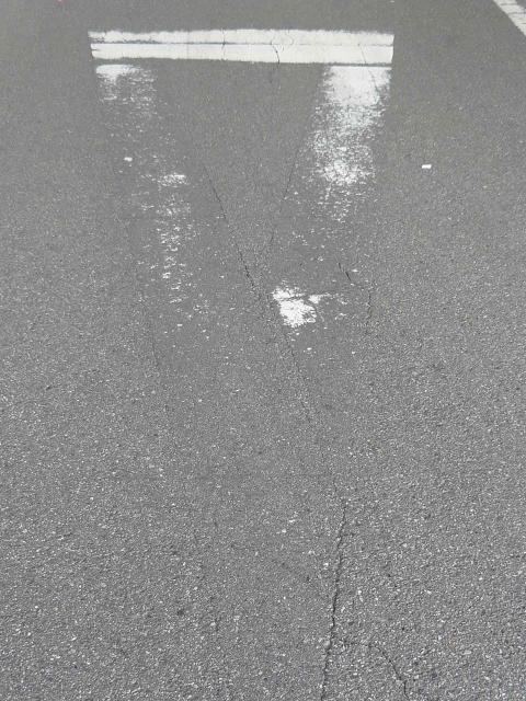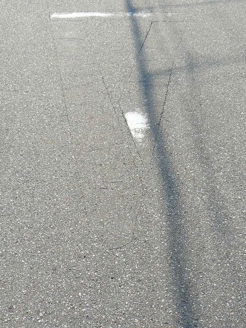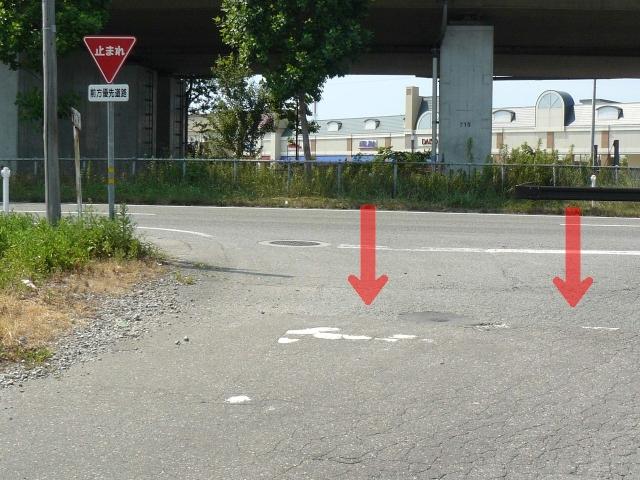 この場所では、以前は「前方優先道路」道路標示が設置されていたようですが、通行帯を変更した際に「直進禁止」の表示を設置したため、撤去されて(削り取られて)しまったようで、形跡が見えます。