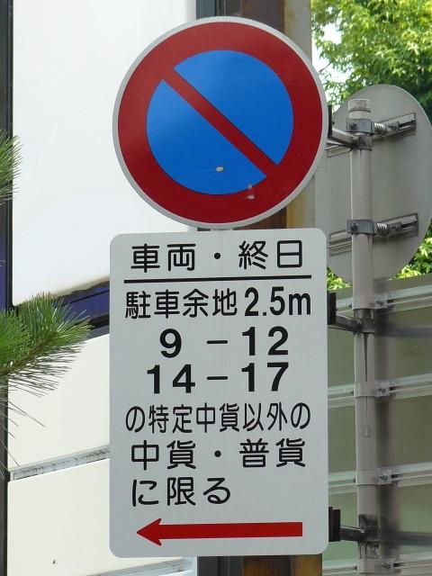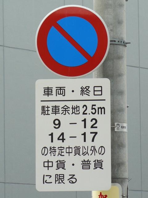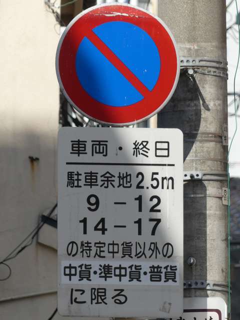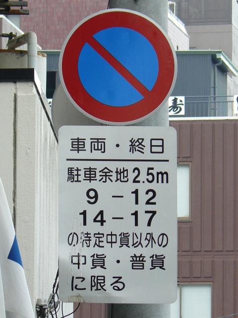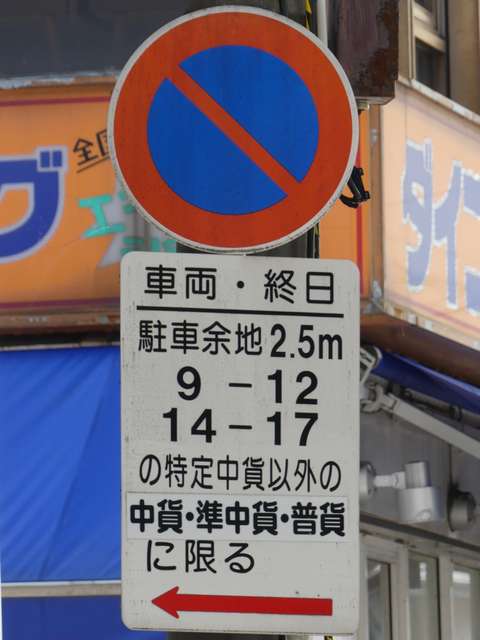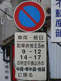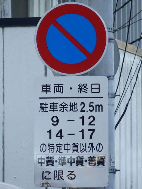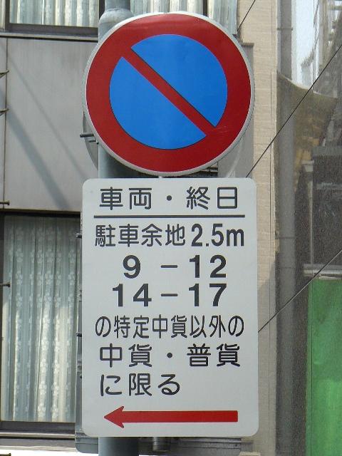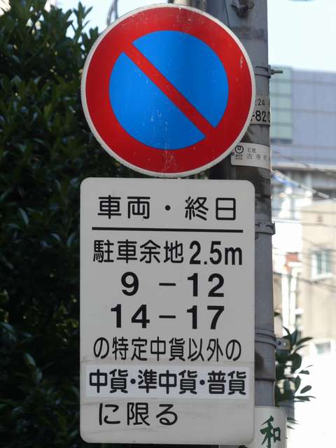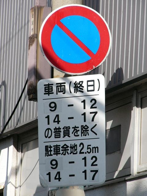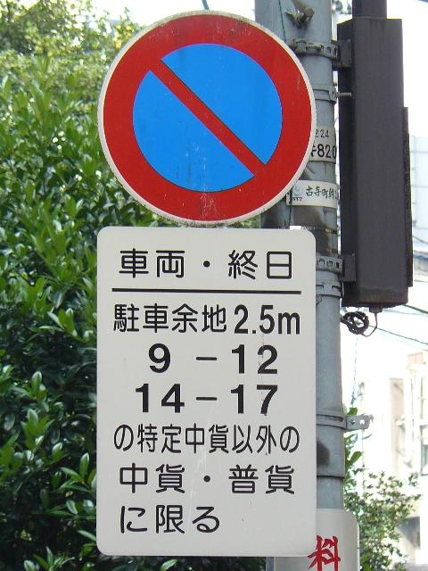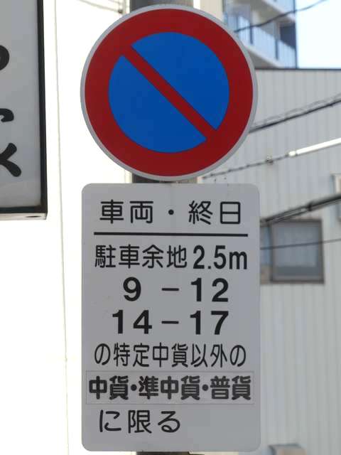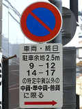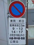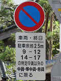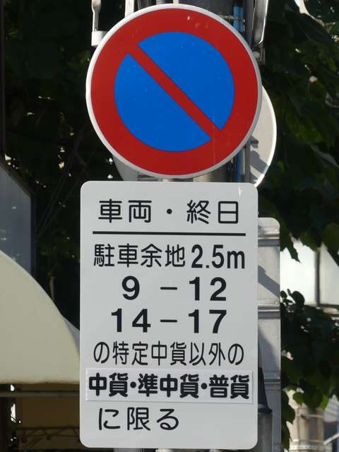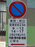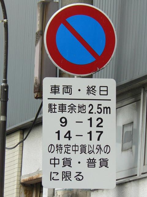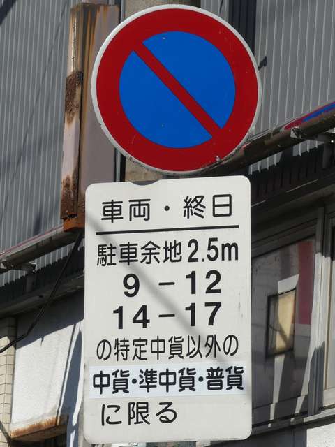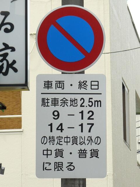 なお、区間内にはこれまた意味不明な立て看板があります。この表示ではいろいろな意味にとられてしまいます。また、標識とは異なり、貨物積降し中の普貨(法令改正後の特定中貨以外の中貨・普貨)に限定しています。 なお北進南進両方向とも、区間内に、補助標識の無い「駐車禁止」標識が何箇所か設置されています。要は「駐車禁止(車両・終日)」標識にあたるものが、「駐車余地」標識から独立して設置されているわけです。このことからも、やはり区間内では余地の有無にかかわらず、全車両が終日「駐車禁止」となると思います。(しかし実際、警察の狙いとしては、道路の狭い部分で駐車できる側をどちらかに限定するための対応のように思います。) 区間内の路上の所々に駐車余地2.5mとなる目安のラインが引かれていますが、1台1台の駐車場所を区切っていないので道路標示「平行駐車」ではないようです。